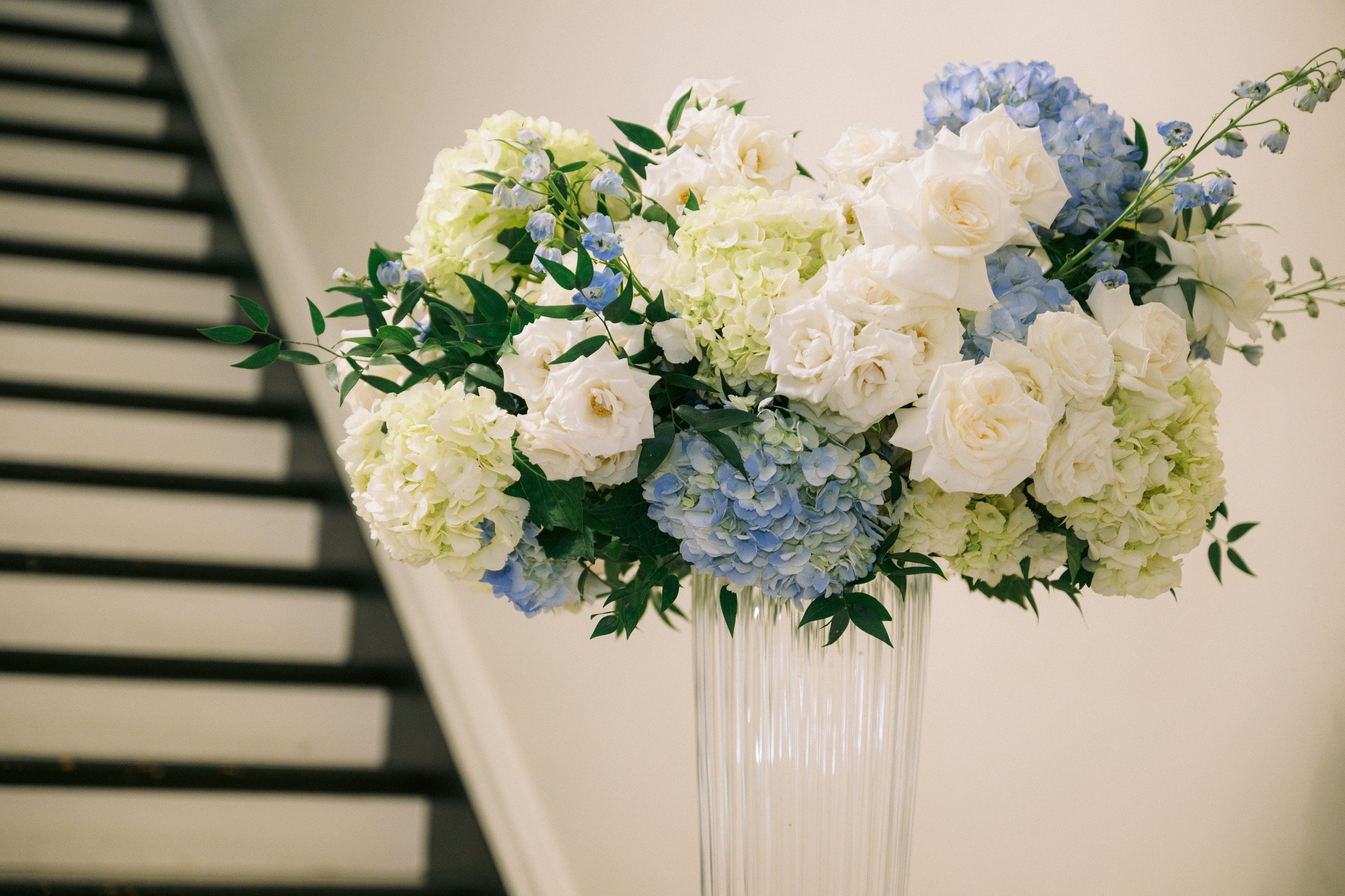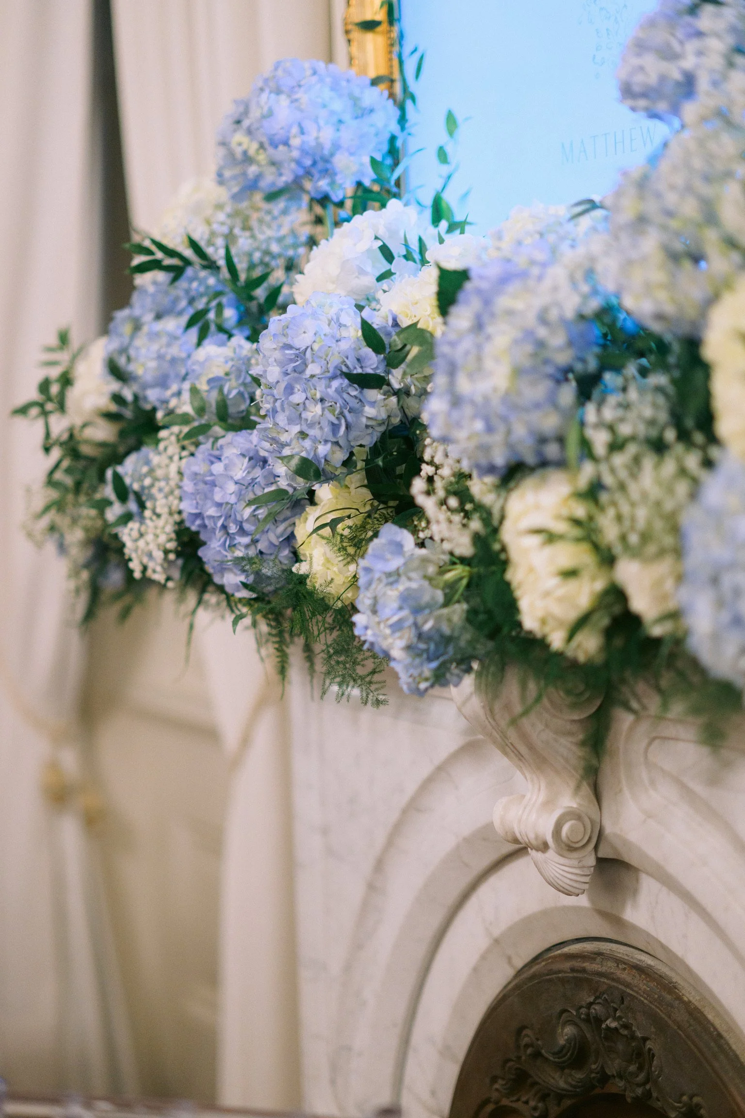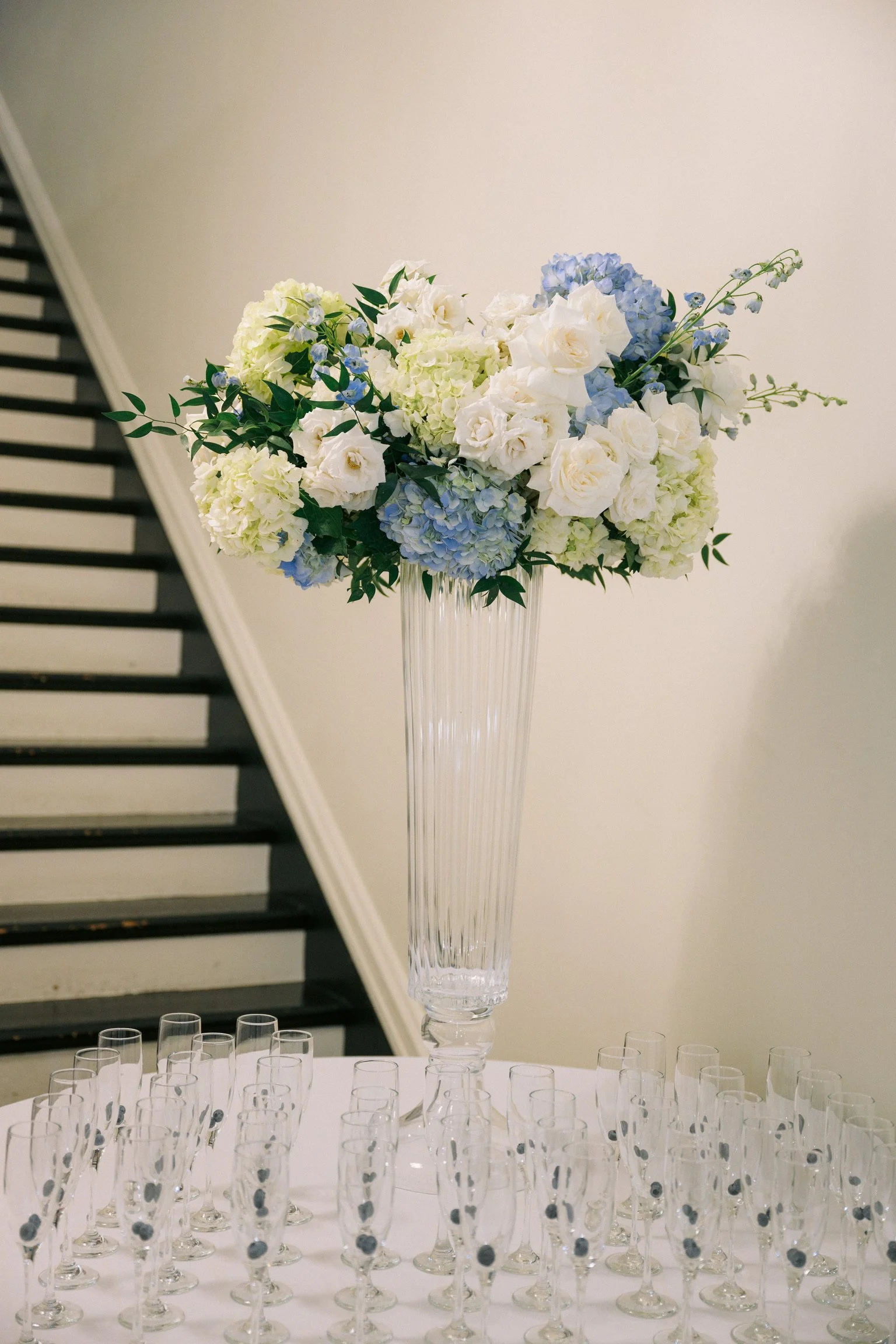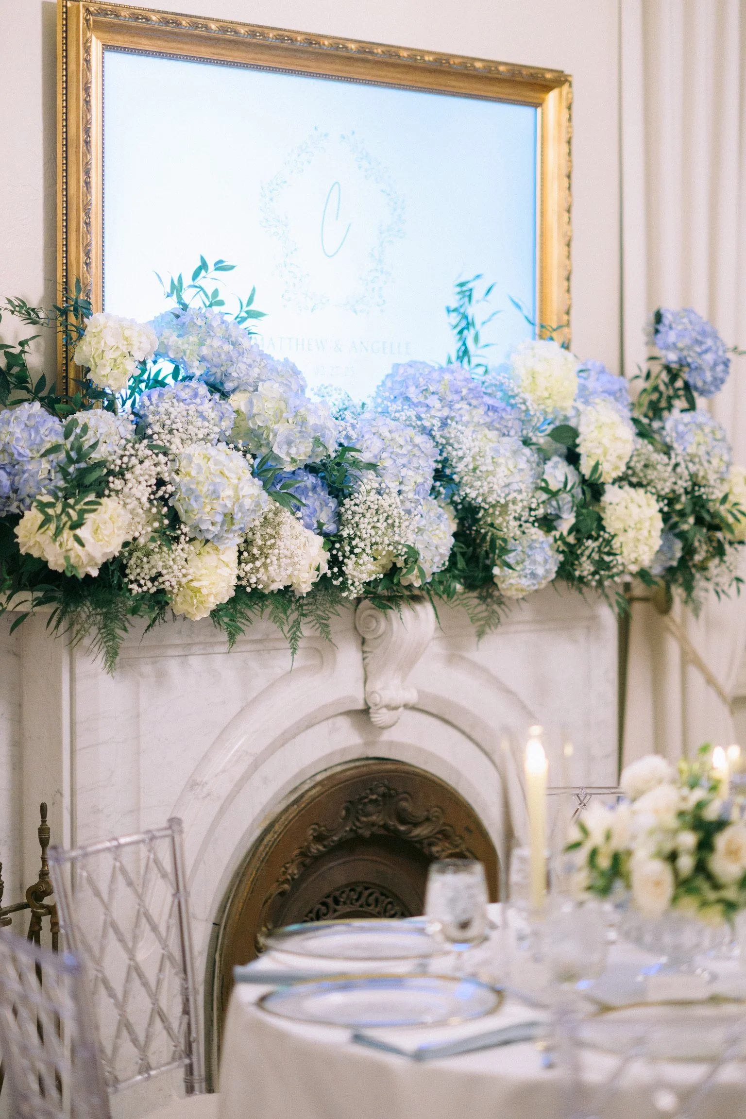 We also designed Angelle’s rehearsal dinner, which had its own unique floral vibe! Angelle’s rehearsal florals closely resembled our Blythe Collection. The dinner was filled with blue hydrangeas (a unique color separate from the wedding palette!). Angelle + Matthew love blue hydrangeas, as the flower was a big part of their proposal + engagement story.