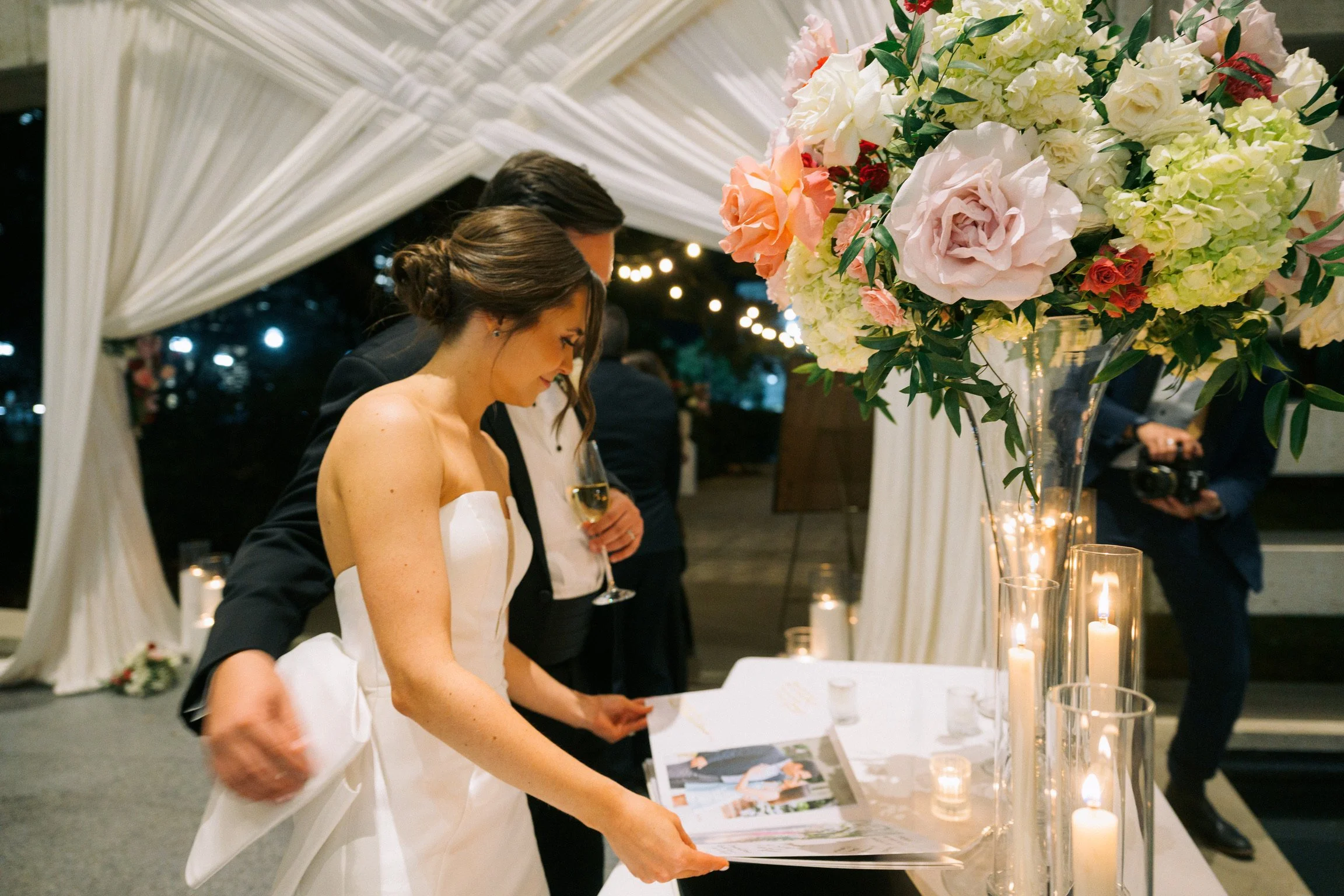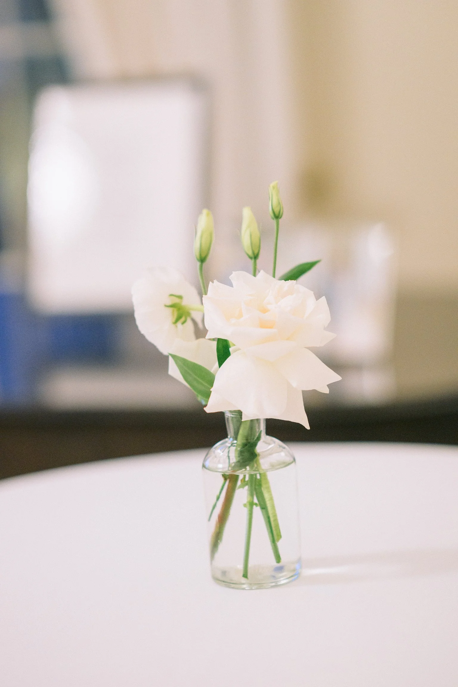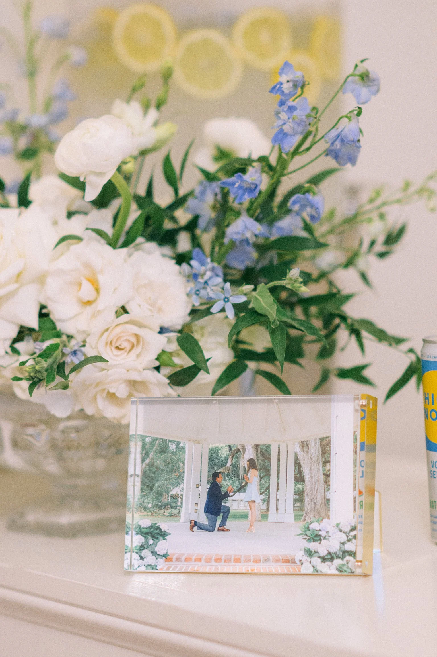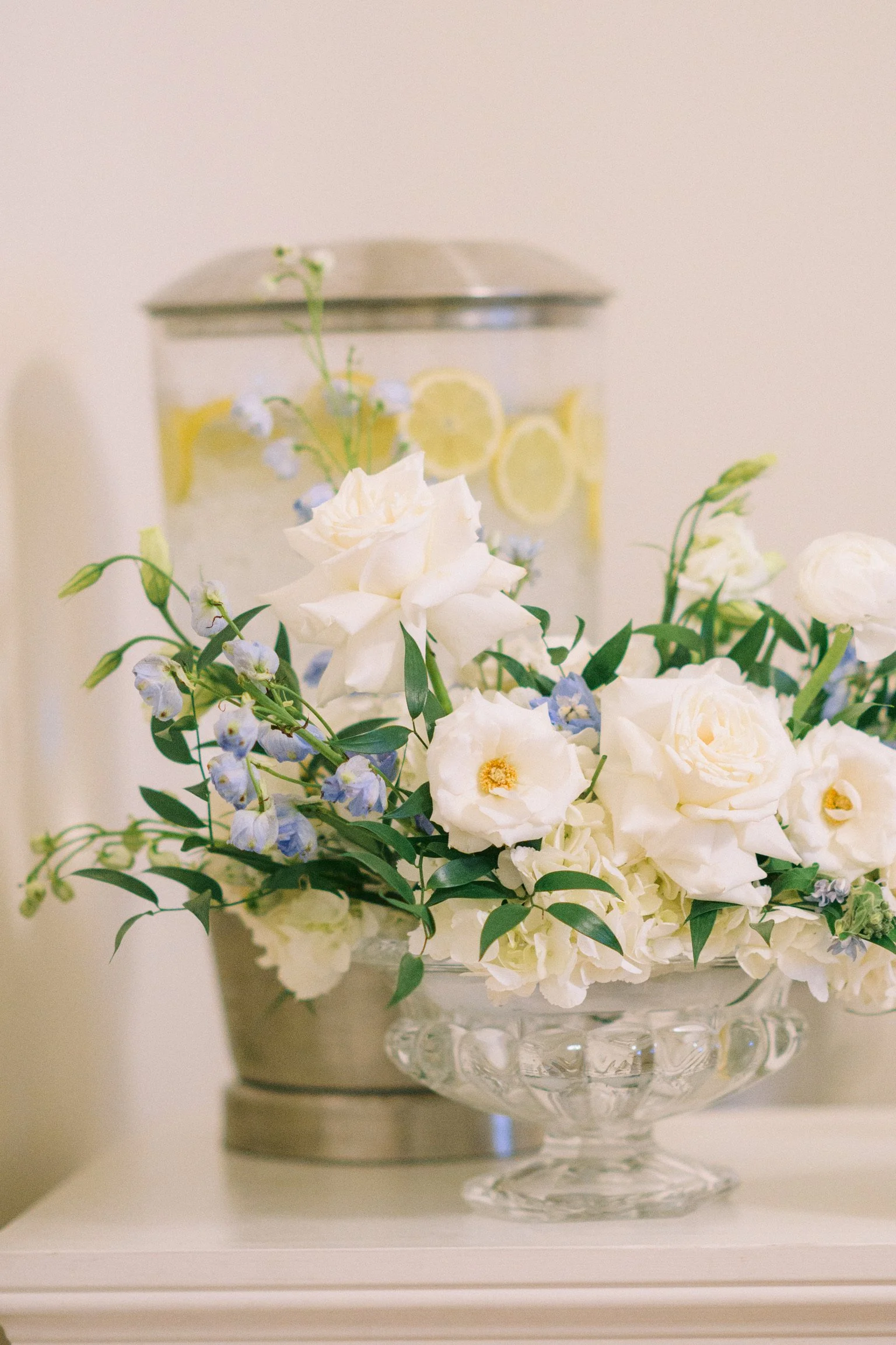 We also designed Angelle’s rehearsal dinner, which had its own unique floral vibe! Angelle’s rehearsal florals closely resembled our Blythe Collection. The dinner was filled with blue hydrangeas (a unique color separate from the wedding palette!). Angelle + Matthew love blue hydrangeas, as the flower was a big part of their proposal + engagement story.