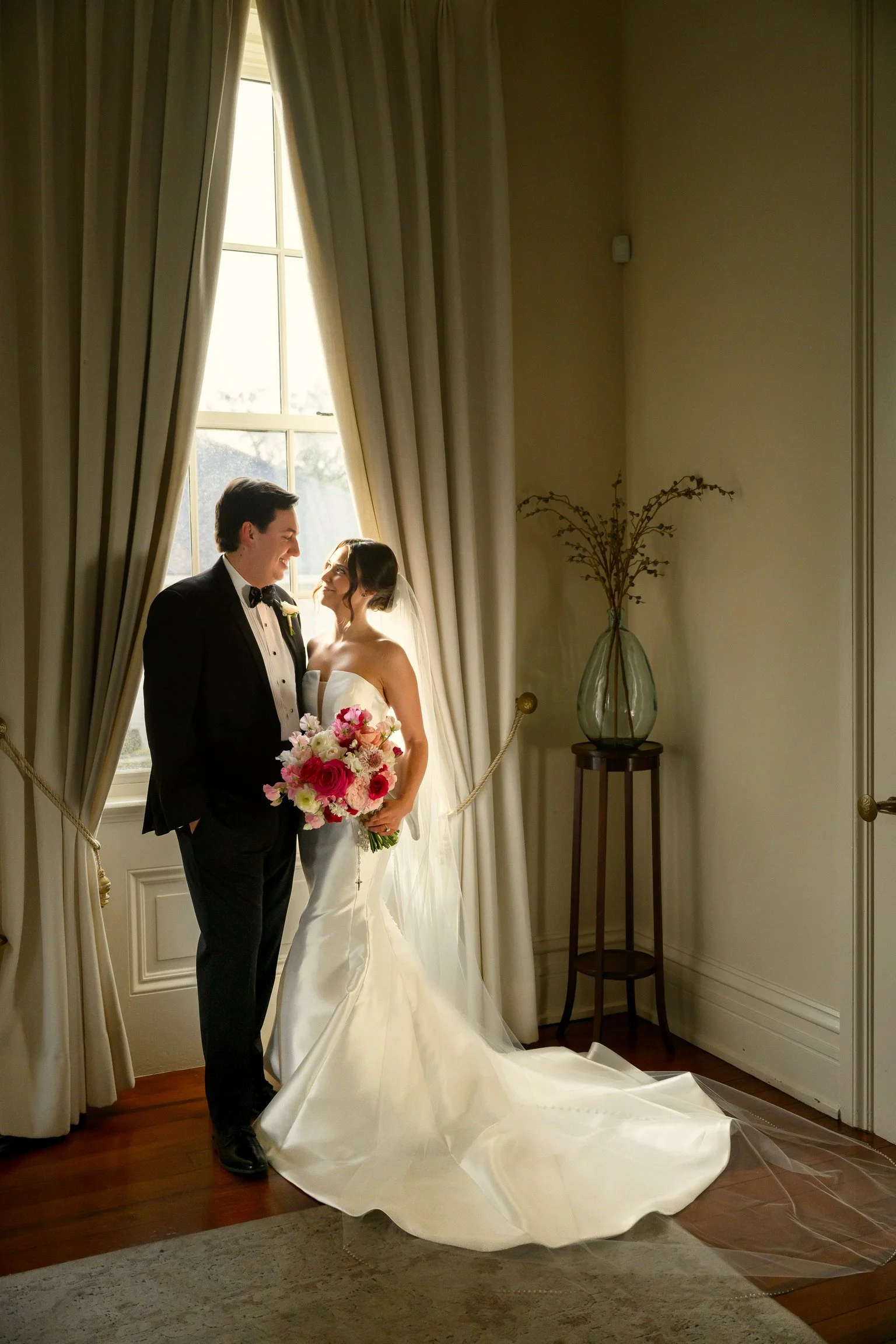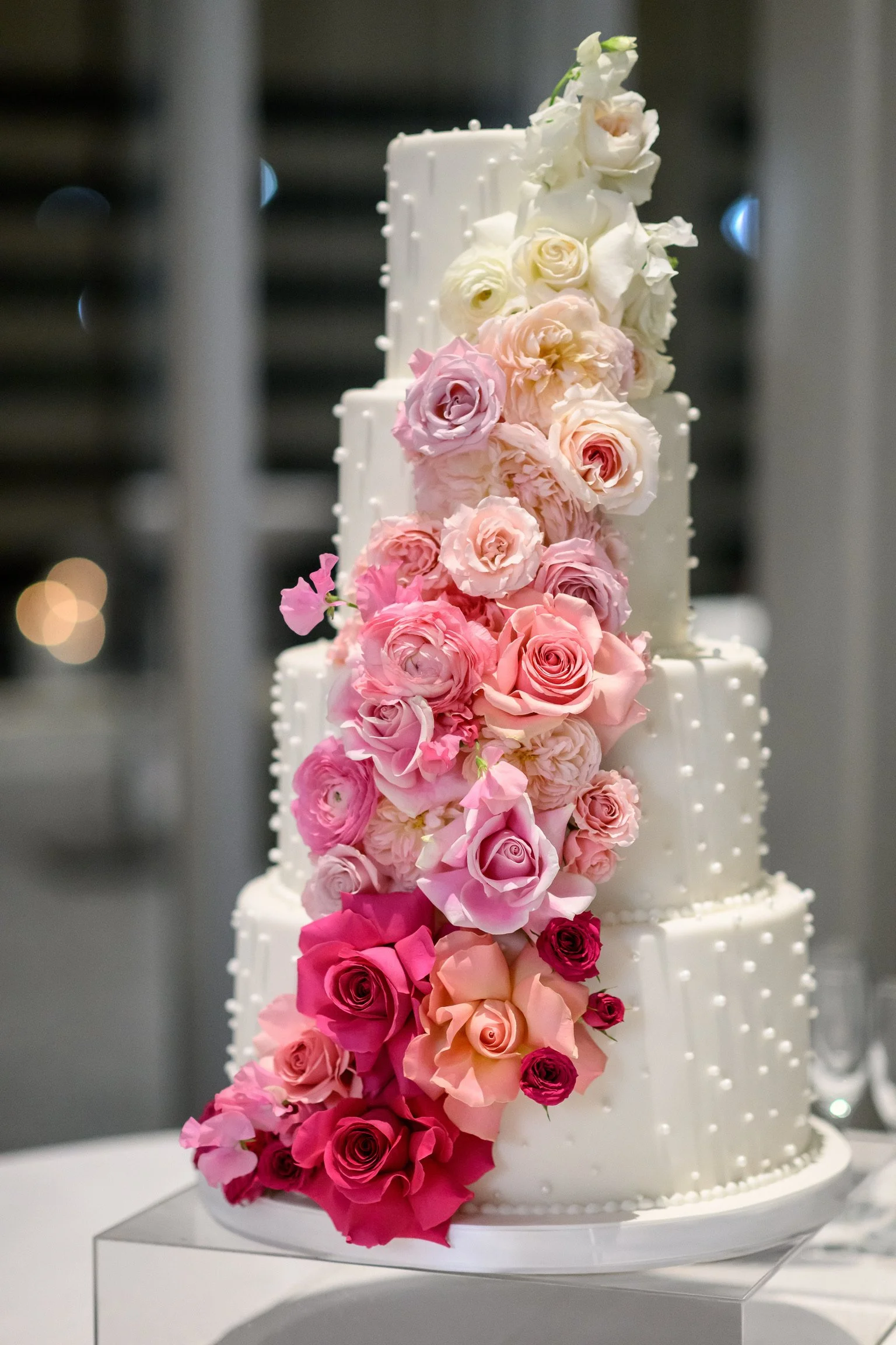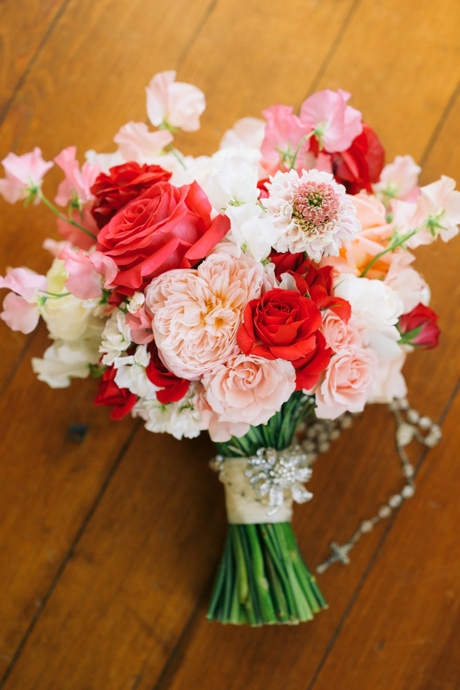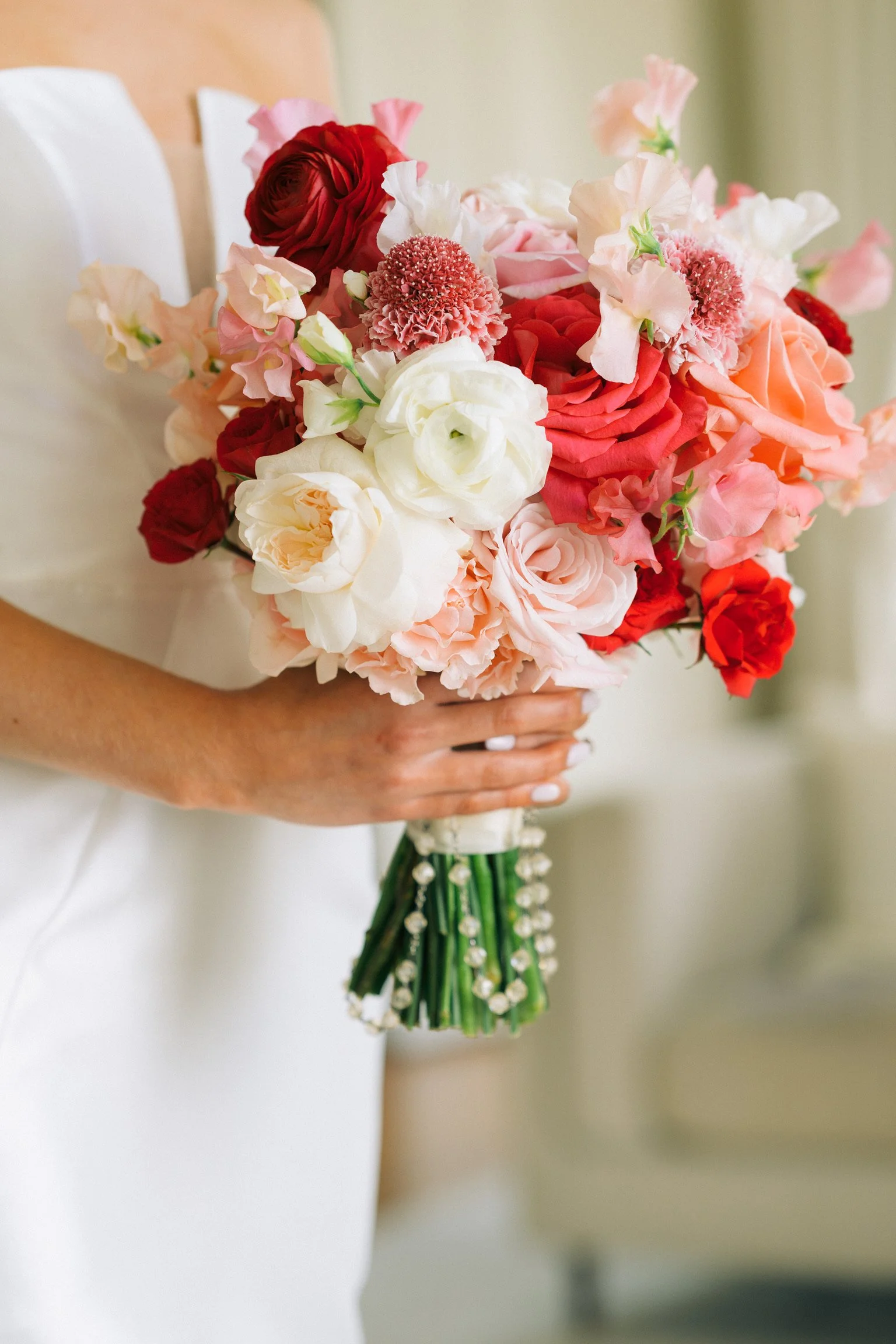 Angelle’s bridal bouquet was a round garden style with an even mixture of white and pale, medium + hot pink shades.