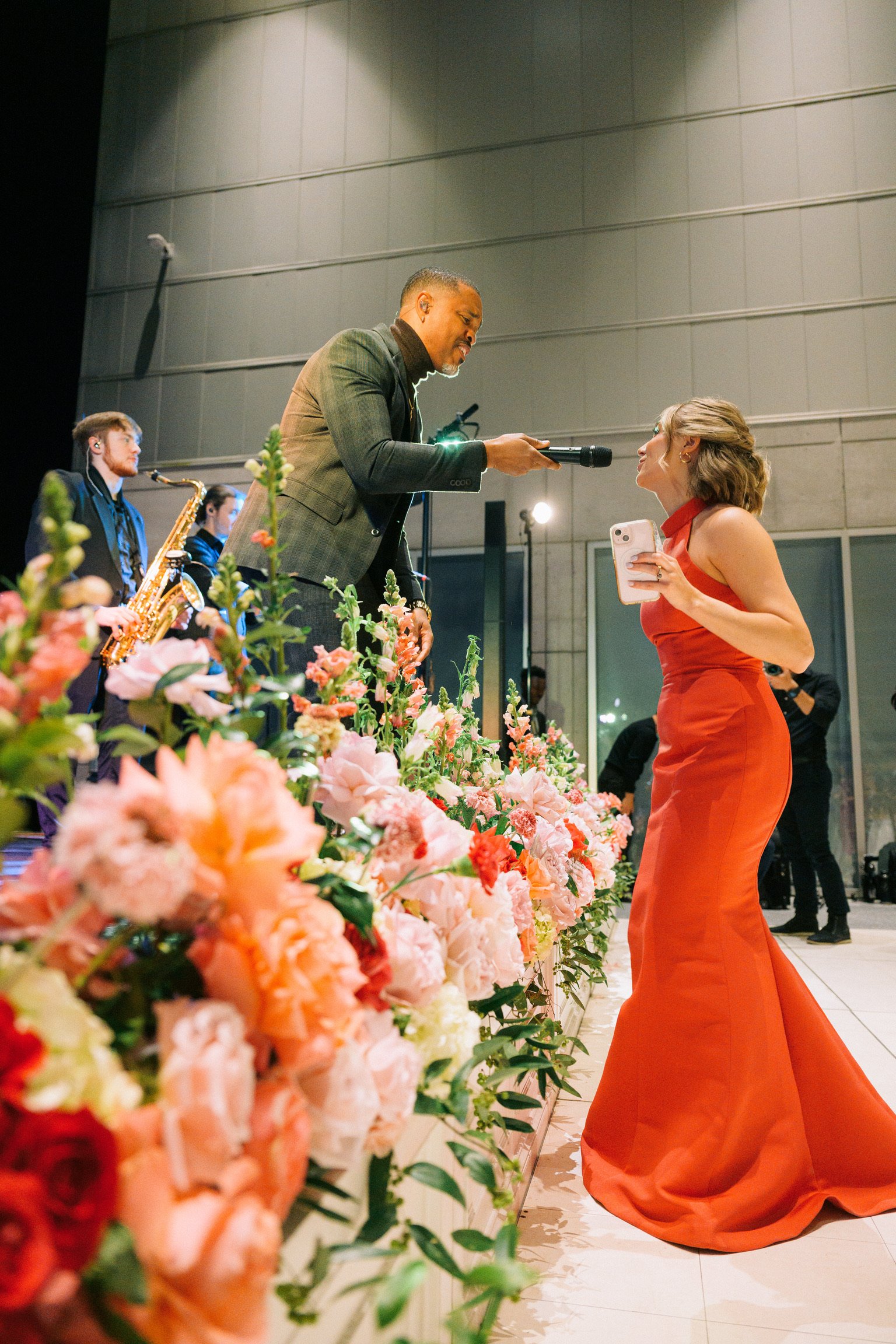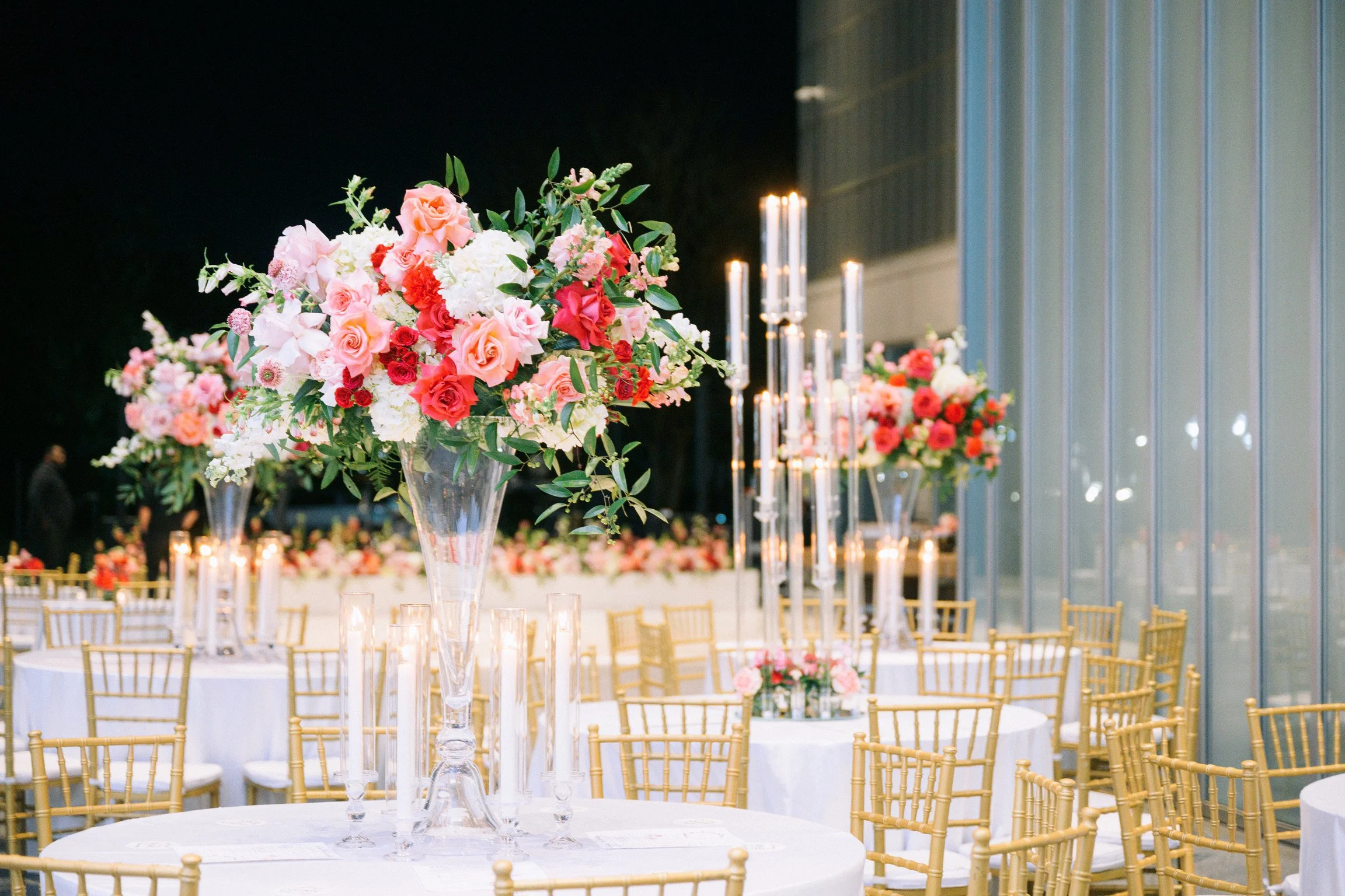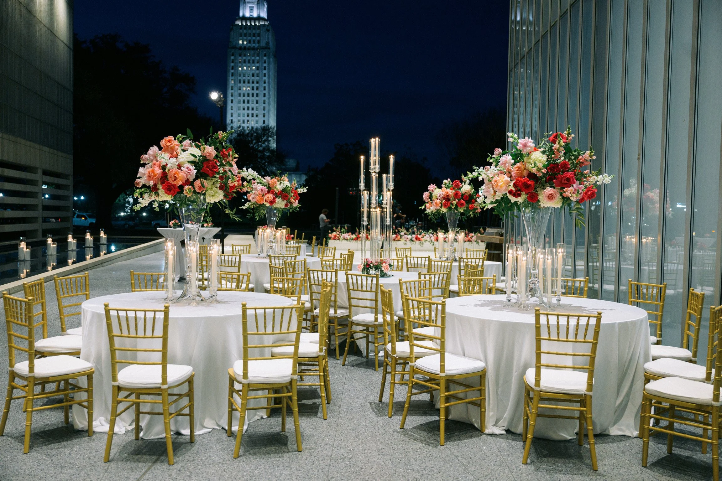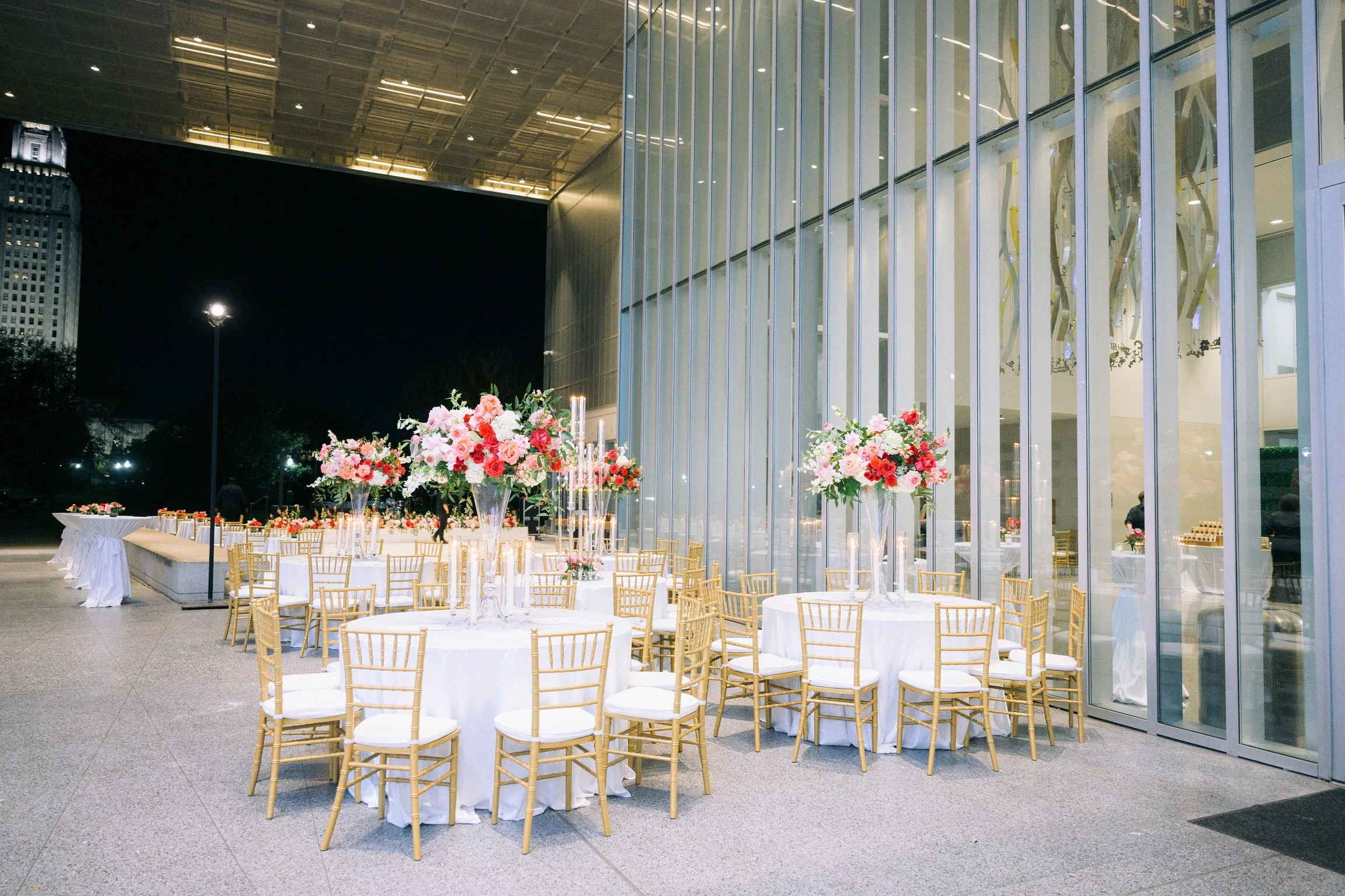 Angelle’s stage front florals were a beautiful spread of symmetrical, wide, burst-style arrangements with height from lots of line flowers. Capitol Park Museum’s outdoor reception space is the perfect backdrop for florals galore!