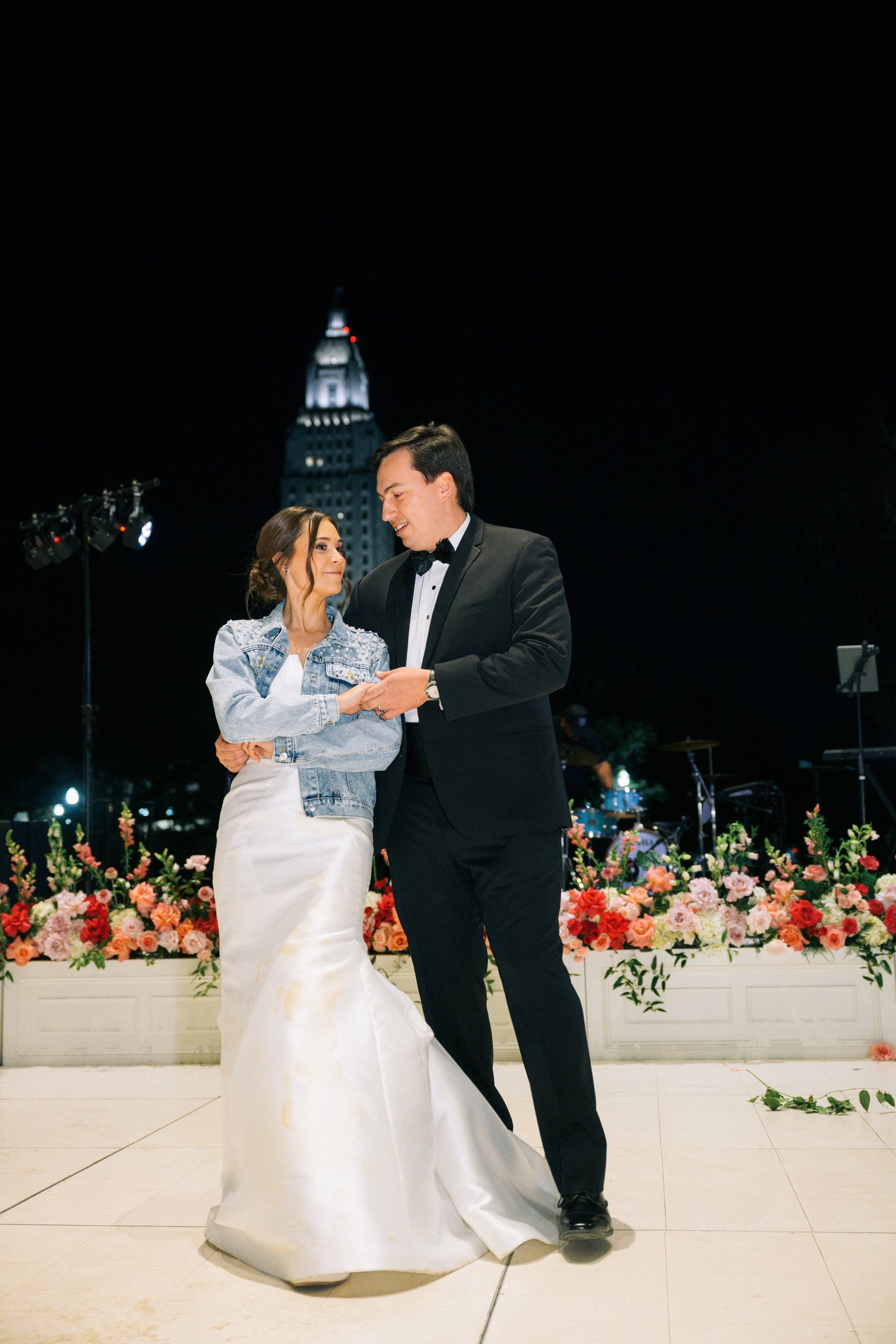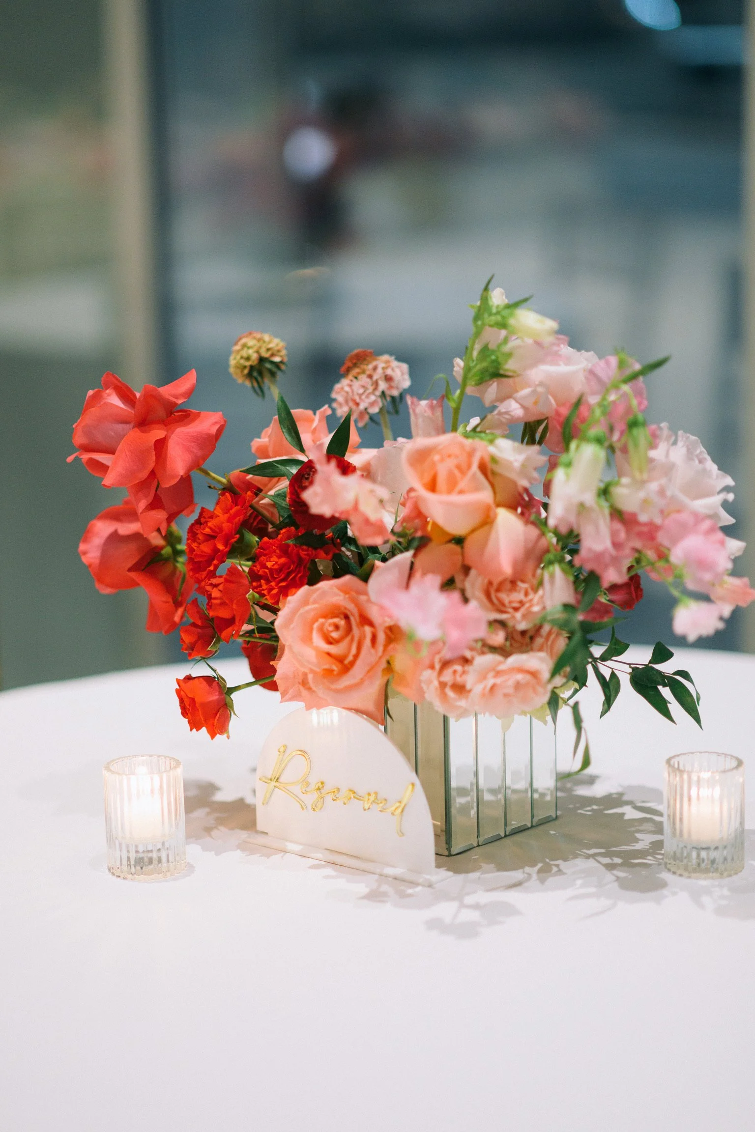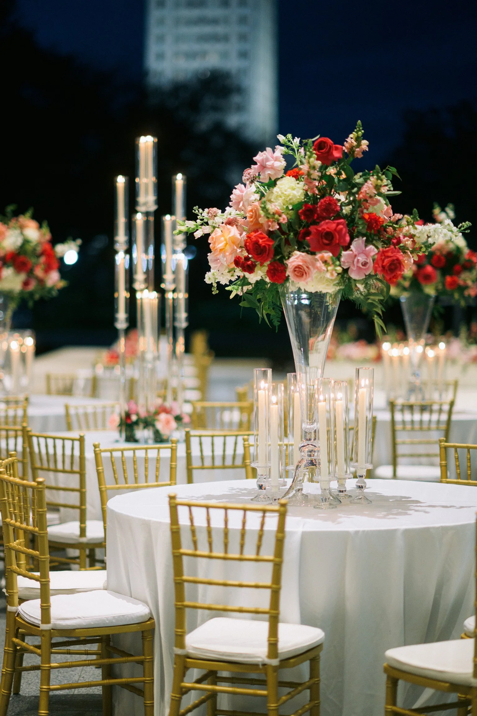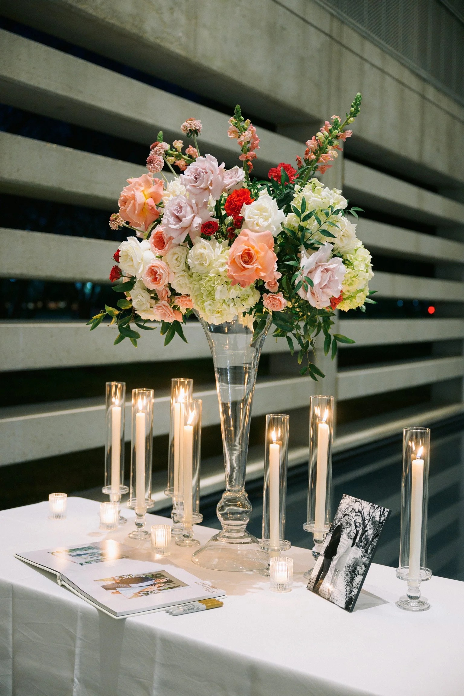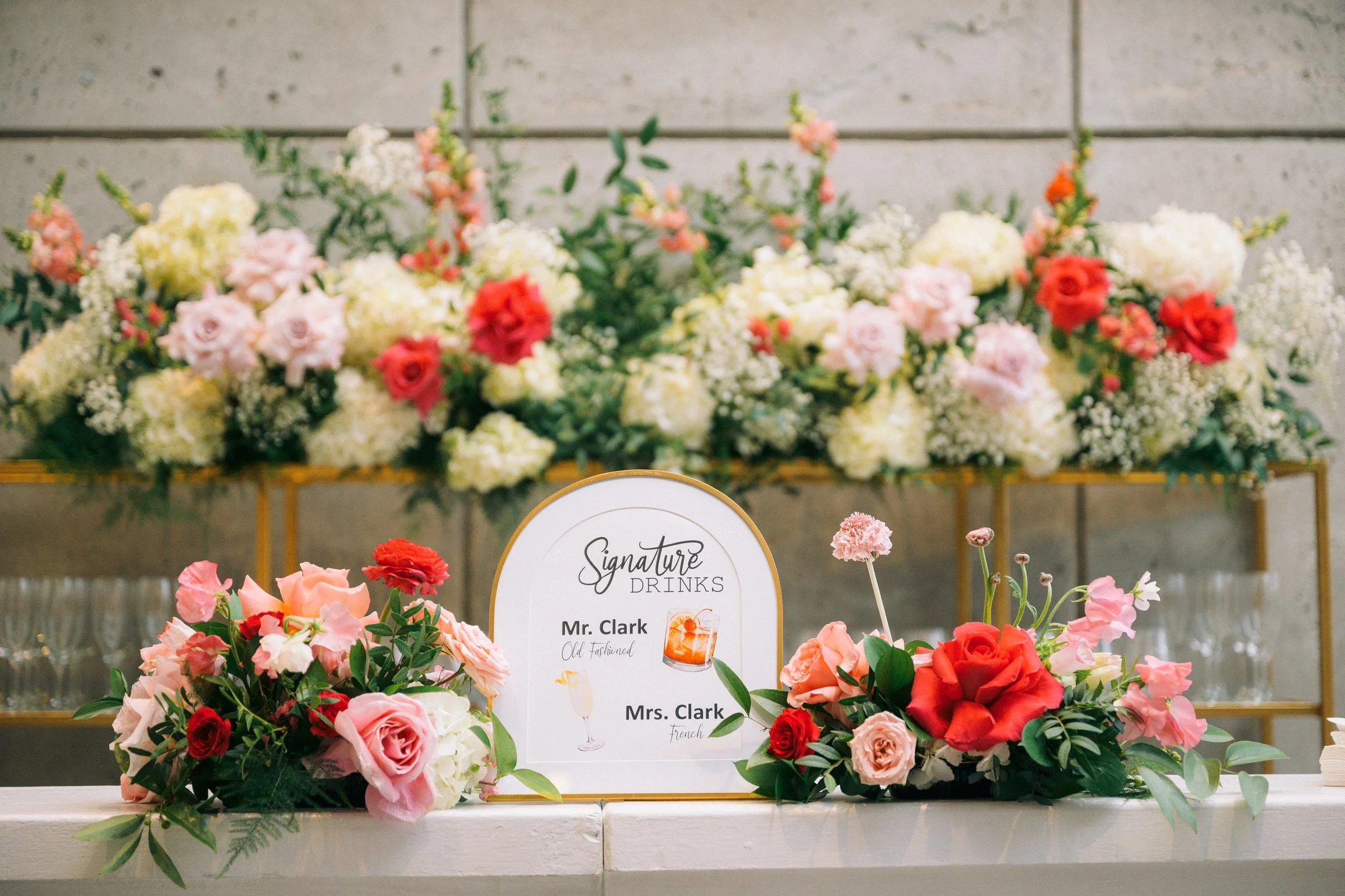 Angelle’s stage front florals were a beautiful spread of symmetrical, wide, burst-style arrangements with height from lots of line flowers. Capitol Park Museum’s outdoor reception space is the perfect backdrop for florals galore!