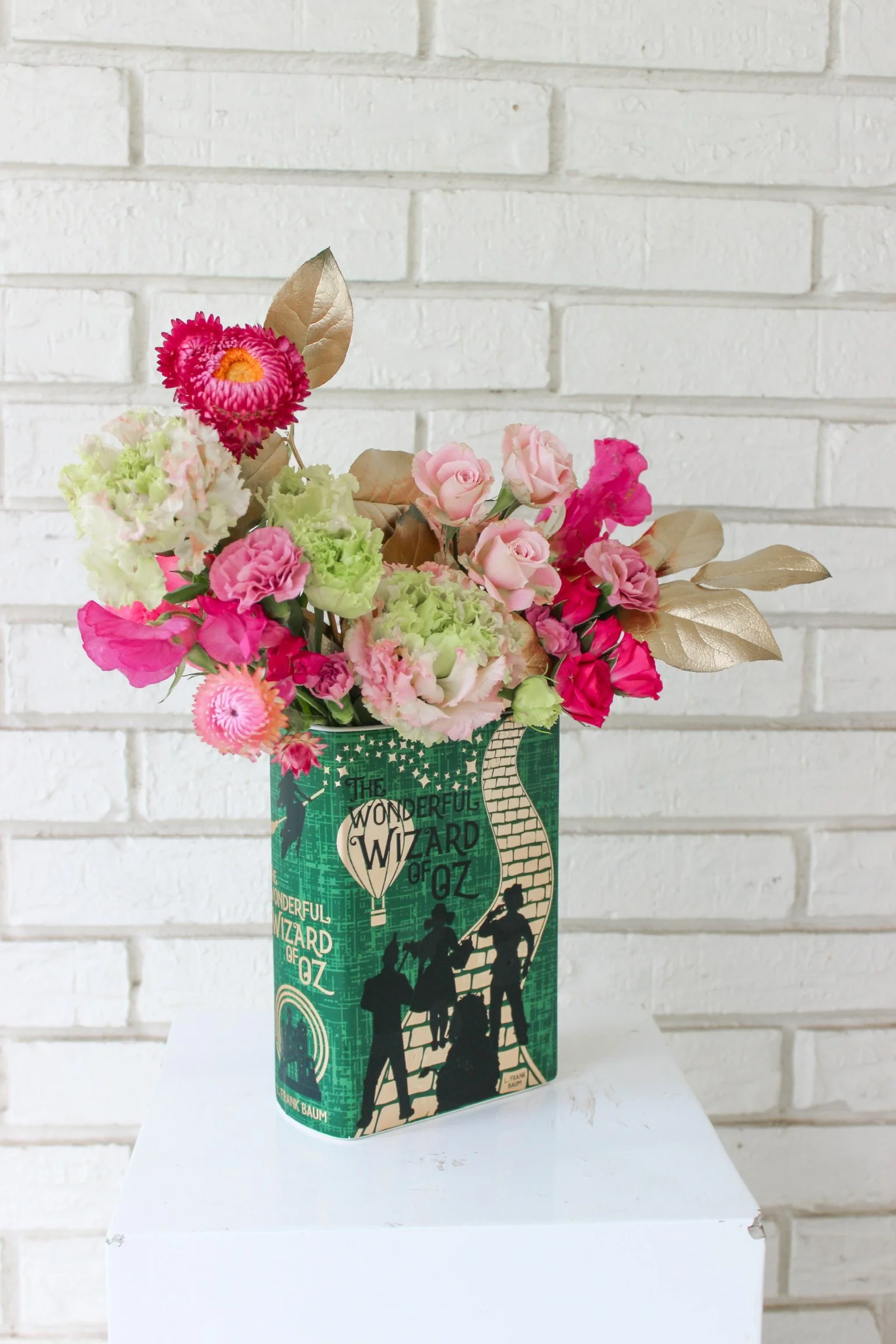 Please note: Flower types, colors + textures vary from photos depending on availability. These photos are examples. Your arrangement will be made to order with seasonal flowers + greenery in the Emma Book Vase.