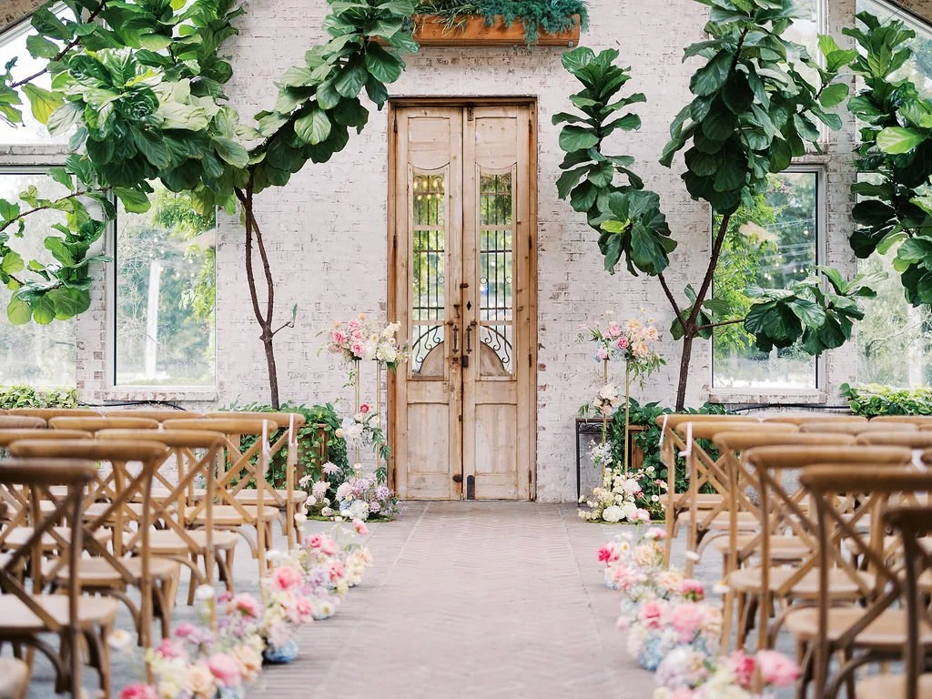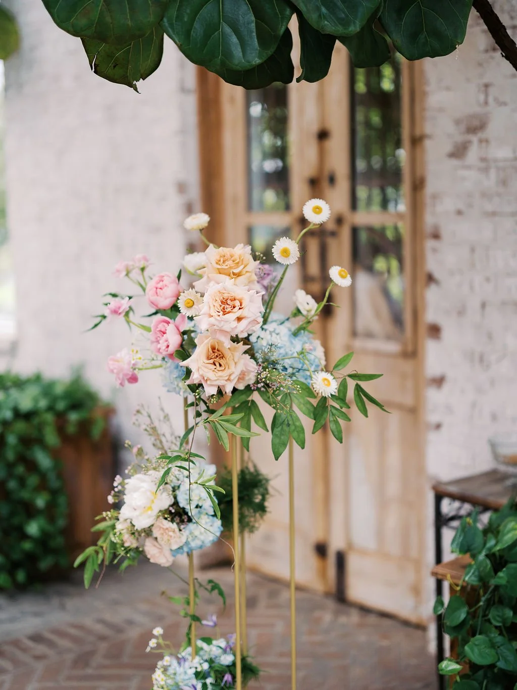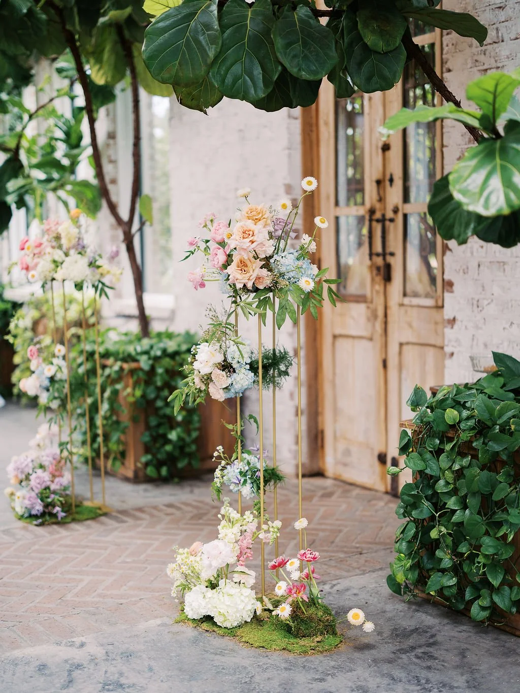 For her ceremony setup, Maura chose our tall gold harlow stands with the most whimsical florals! We placed two floral bursts on top of the stands and ziptied smaller bursts to the stand legs. The trailing effect made the ceremony installation look like it grew naturally along the harlow. We mossed the bases of the stands + added a burst on the ground to further accentuate that organic look.