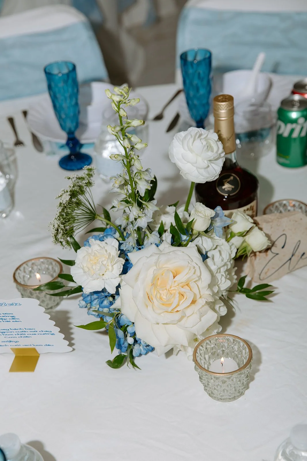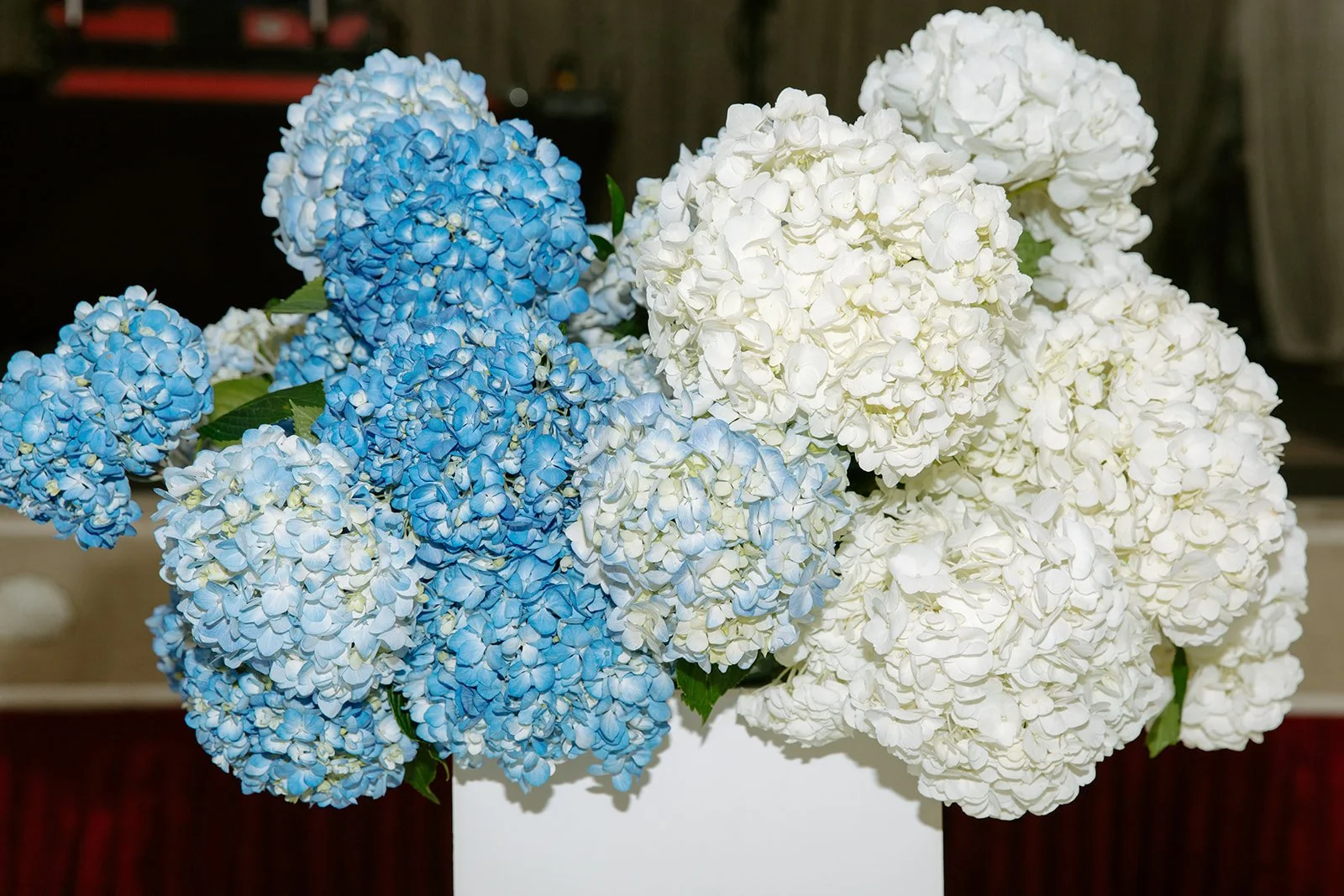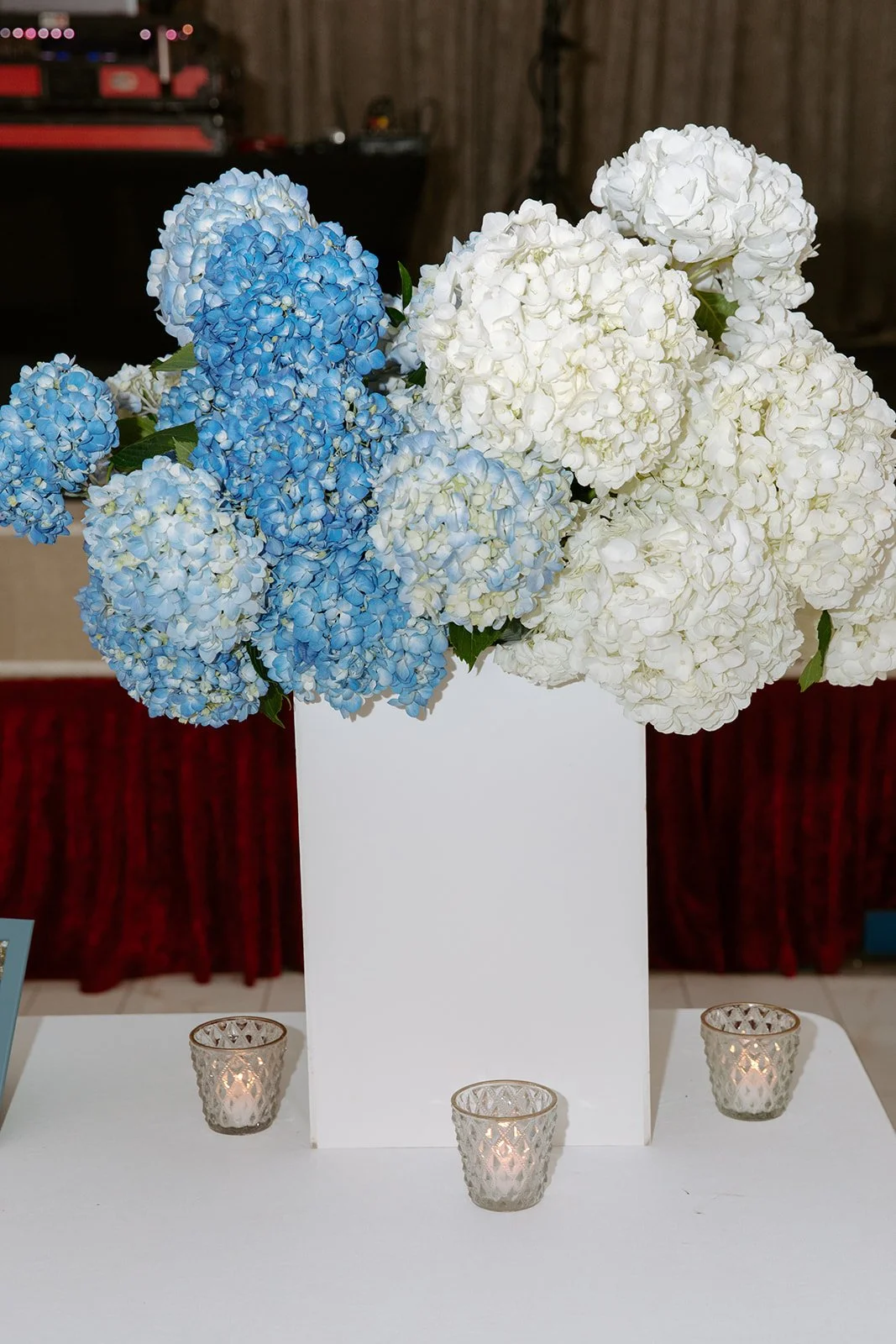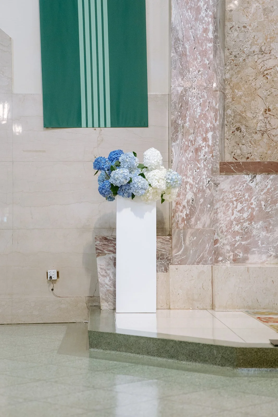 We used a color blocking technique for Truc’s hydrangea arrangements, with all blue shades on one side and white on the other. These hydrangea bursts were placed on our large blanc columns for the church ceremony. Our team then flipped one of the hydrangea bursts to our white acrylic box on the sign-in table and the other burst to the base of Truc + Paul’s sweetheart table at the reception.