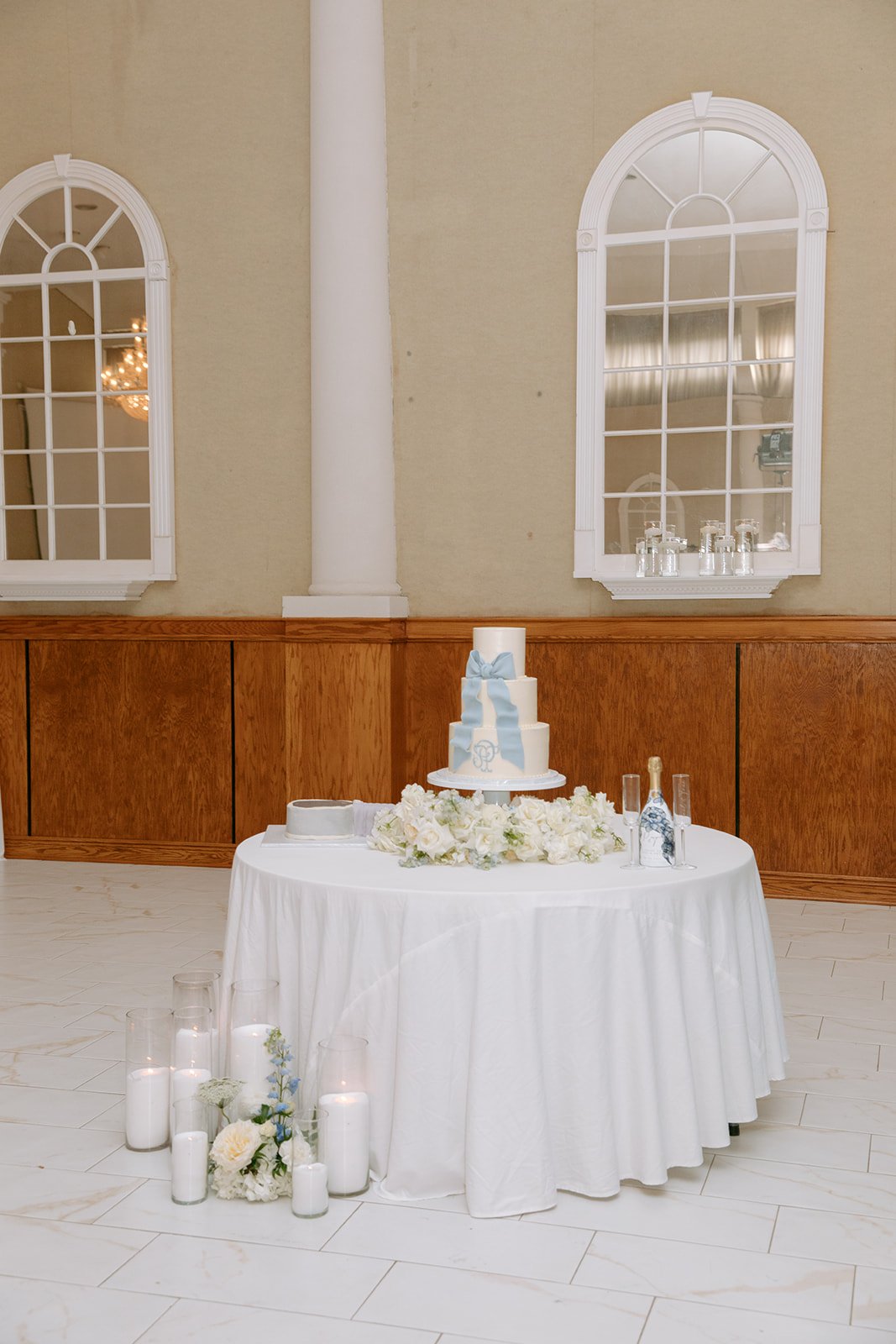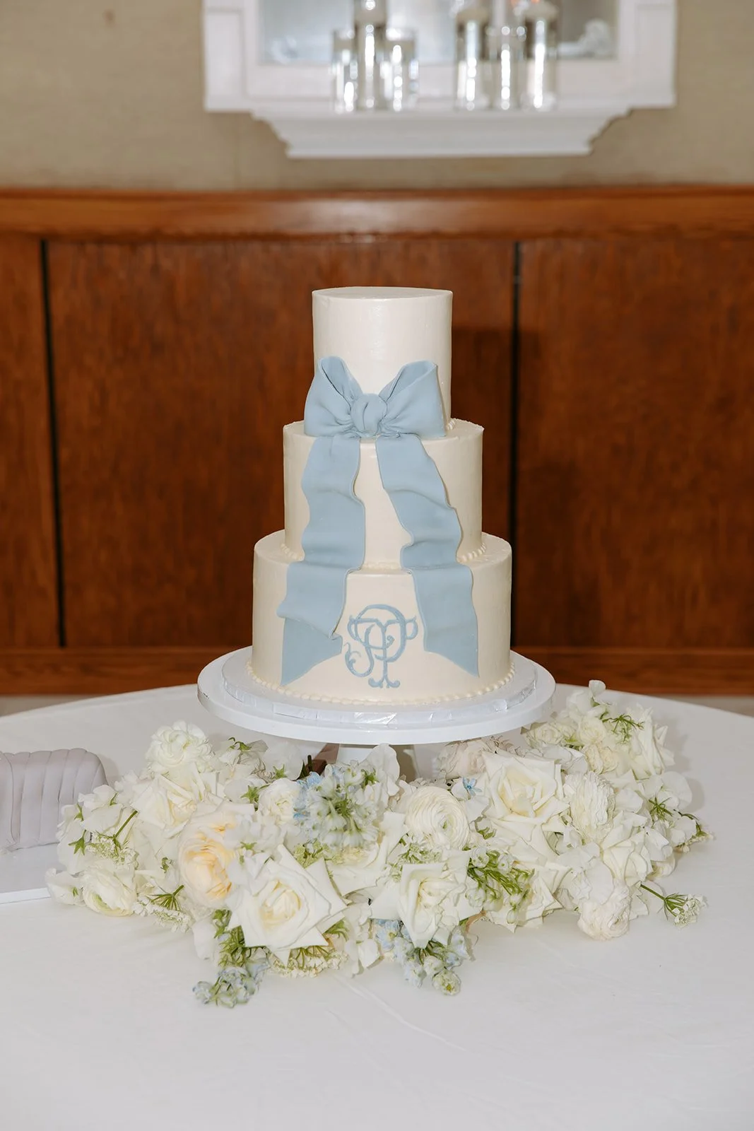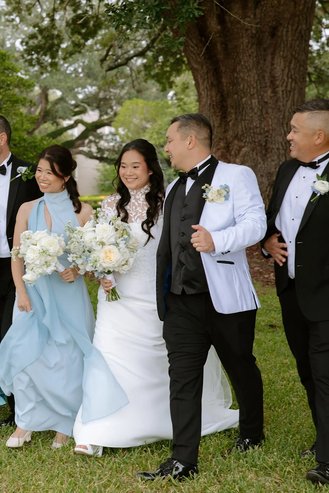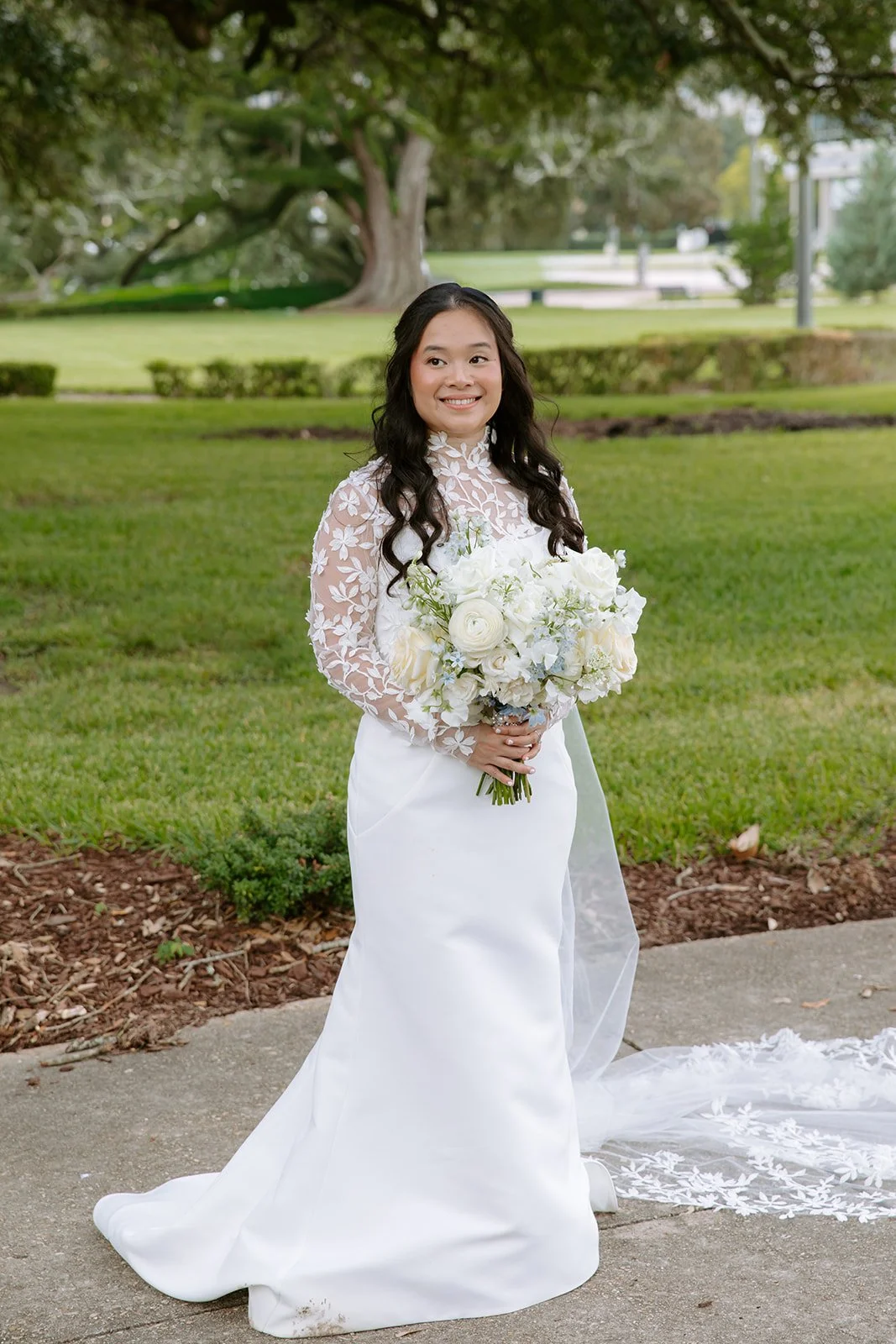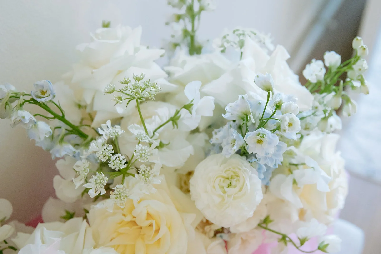 We used a color blocking technique for Truc’s hydrangea arrangements, with all blue shades on one side and white on the other. These hydrangea bursts were placed on our large blanc columns for the church ceremony. Our team then flipped one of the hydrangea bursts to our white acrylic box on the sign-in table and the other burst to the base of Truc + Paul’s sweetheart table at the reception.
