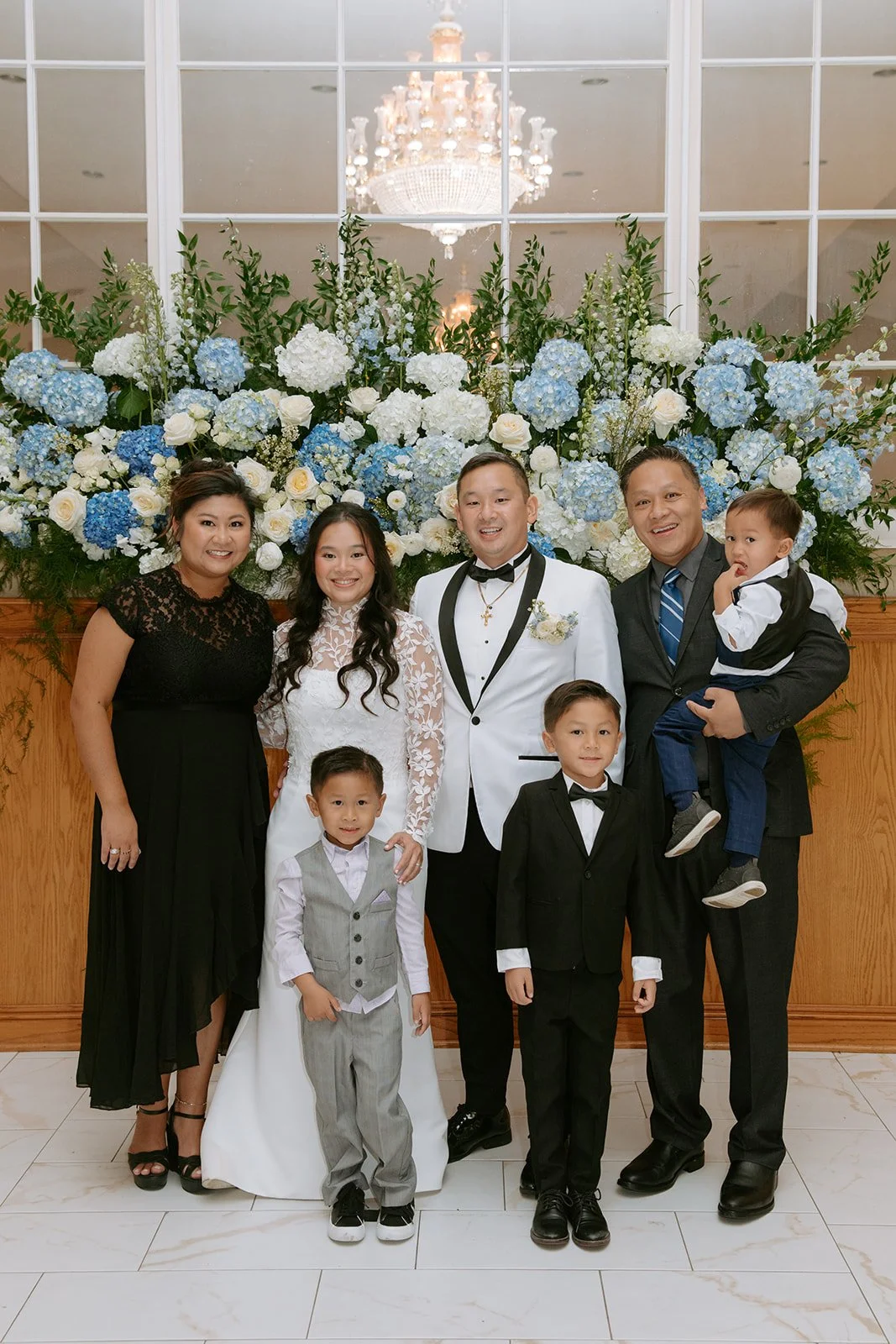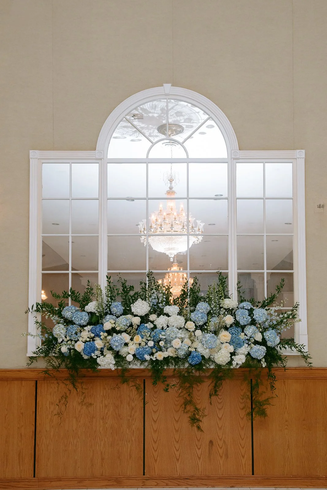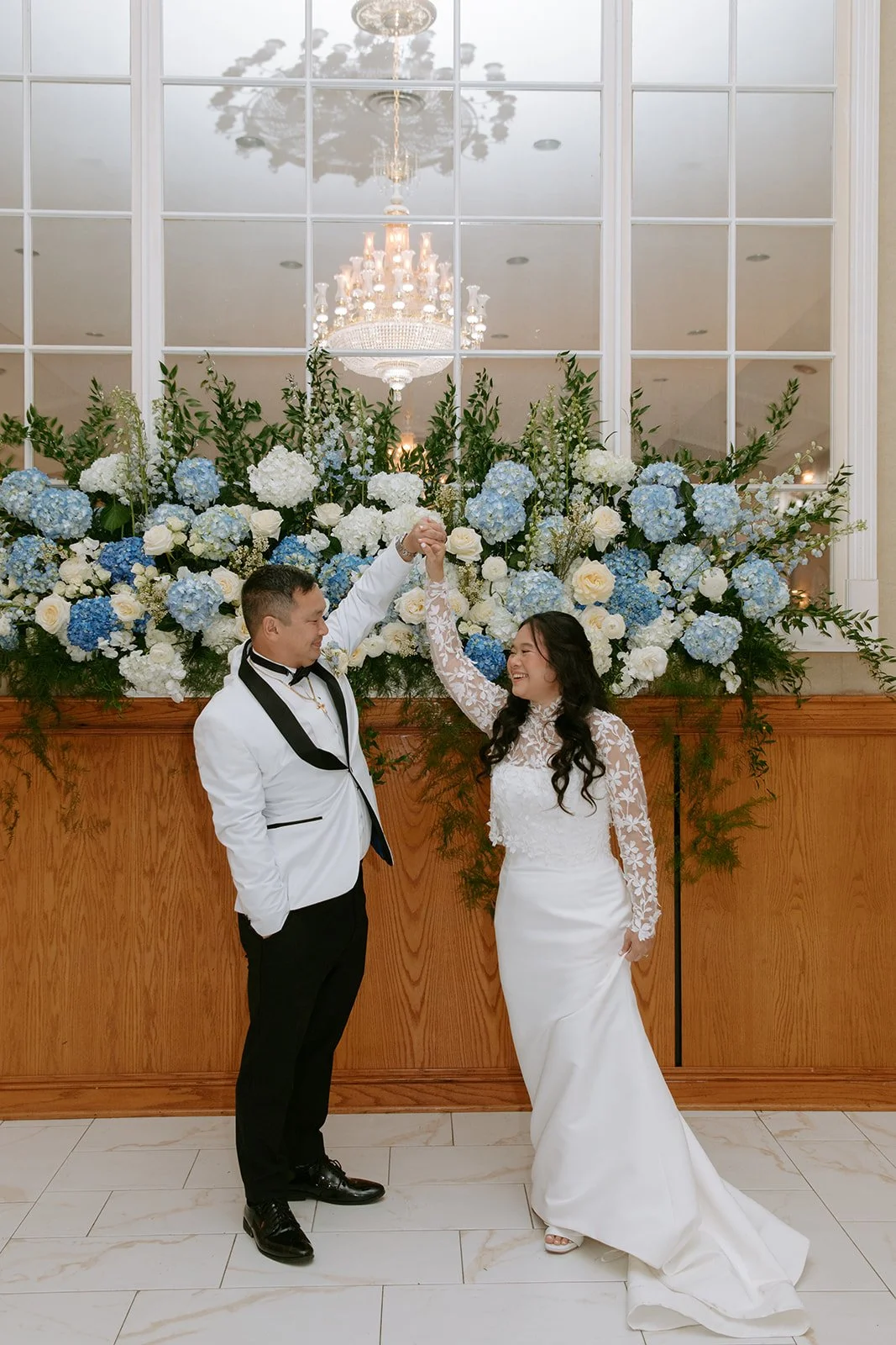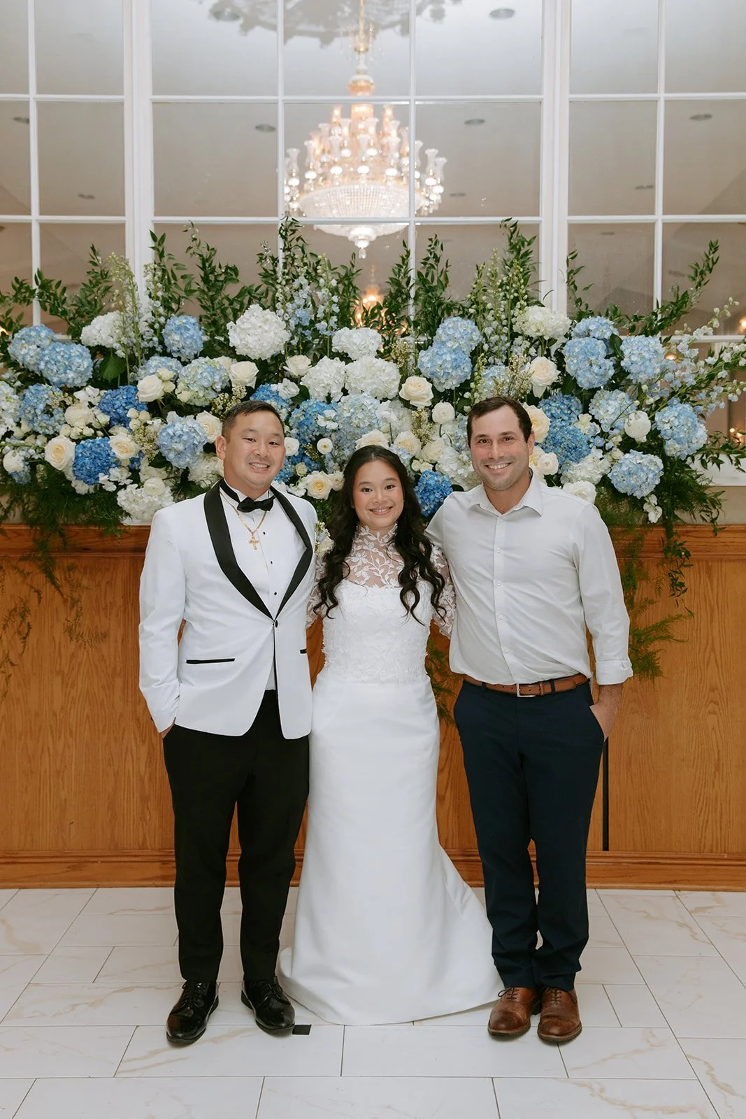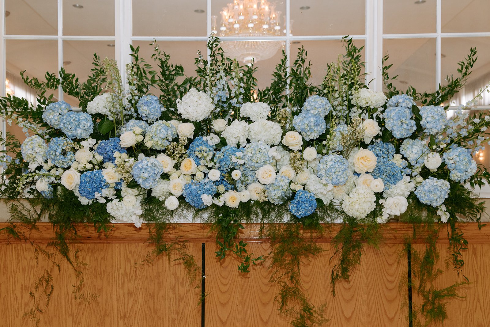 Truc had a traditional Vietnamese wedding with a morning tea ceremony, afternoon mass and evening reception with a 9-course meal. As part of Vietnamese tradition, the bride + groom take a photo with every guest. We designed a gorgeous (and gigantic!) blue + white hydrangea installation to serve as the photo backdrop. Due to the size of the mantel, Hannah designed this entire installation on-site!