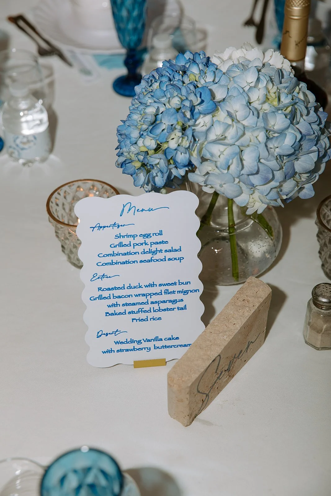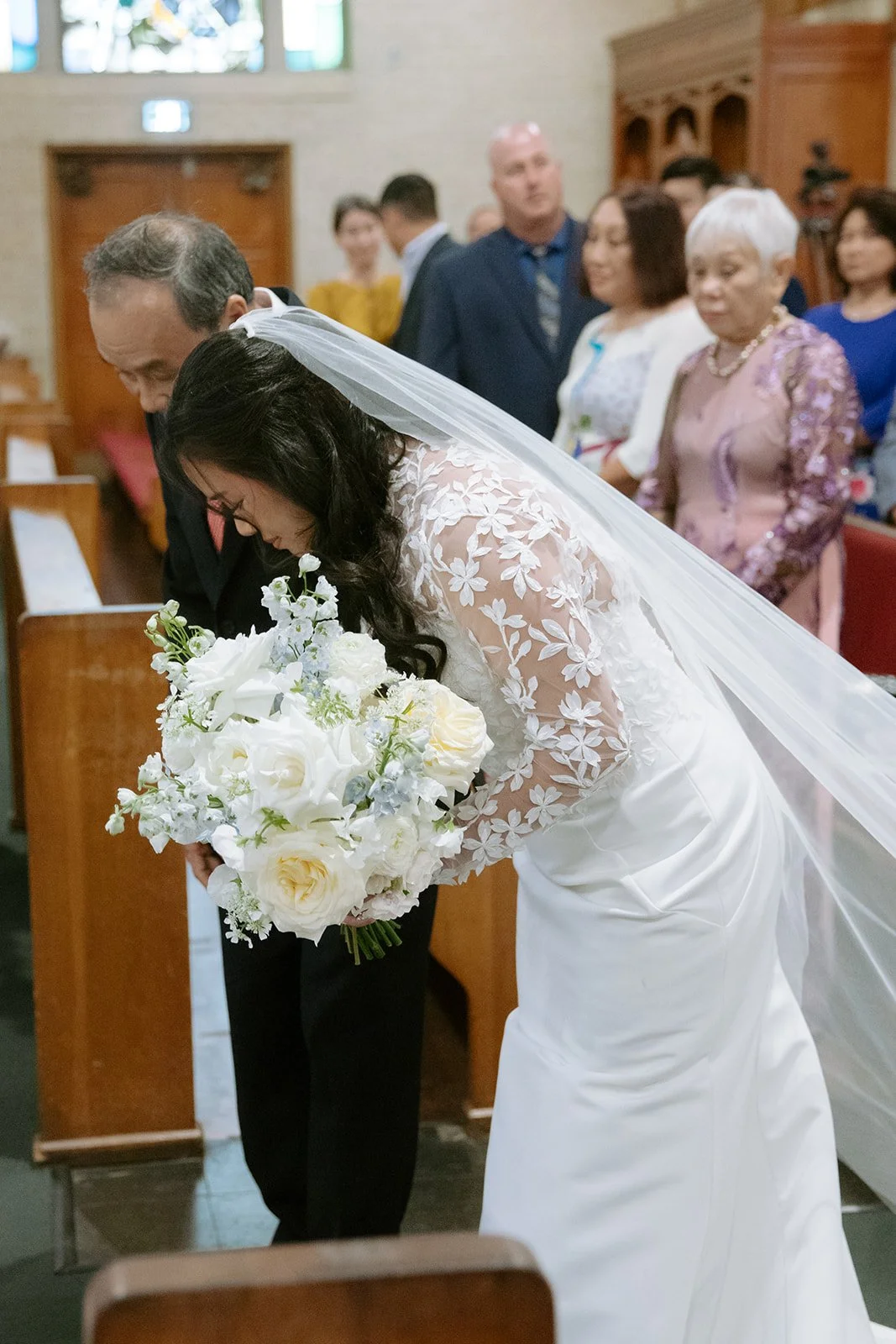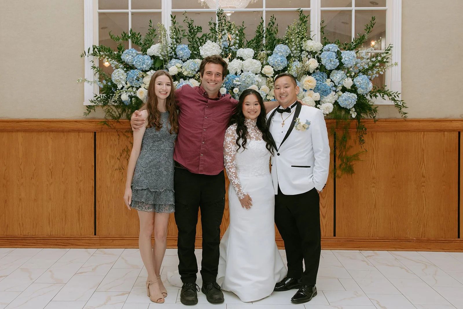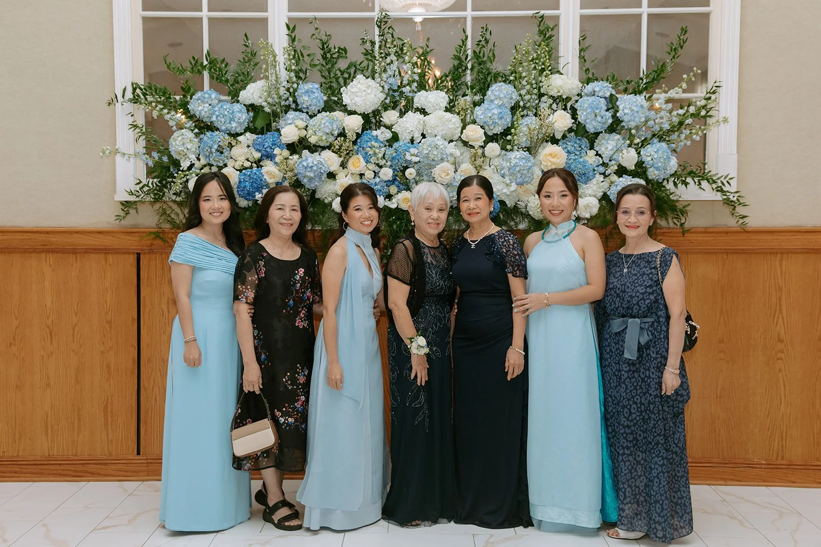 Truc had a traditional Vietnamese wedding with a morning tea ceremony, afternoon mass and evening reception with a 9-course meal. As part of Vietnamese tradition, the bride + groom take a photo with every guest. We designed a gorgeous (and gigantic!) blue + white hydrangea installation to serve as the photo backdrop. Due to the size of the mantel, Hannah designed this entire installation on-site!
