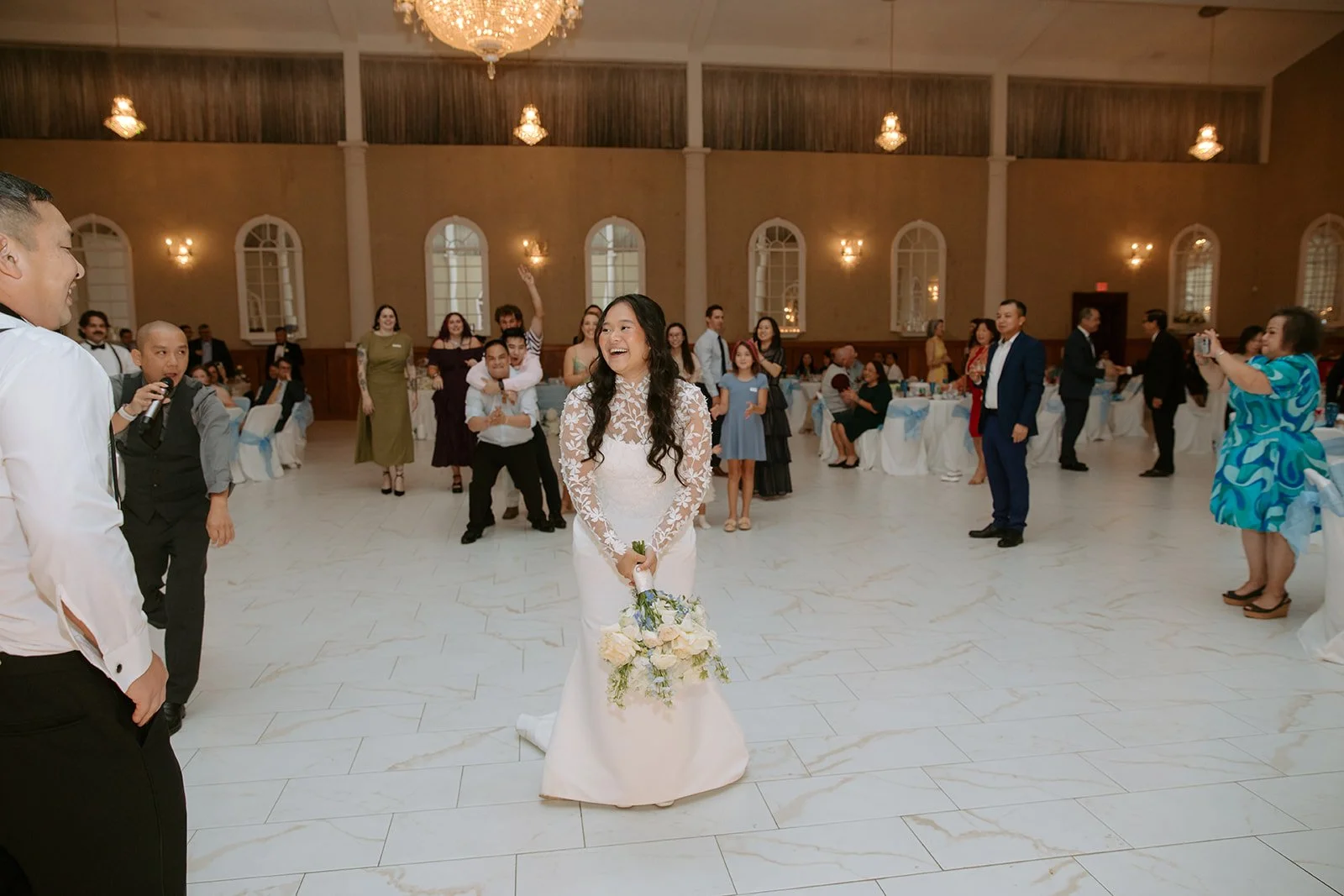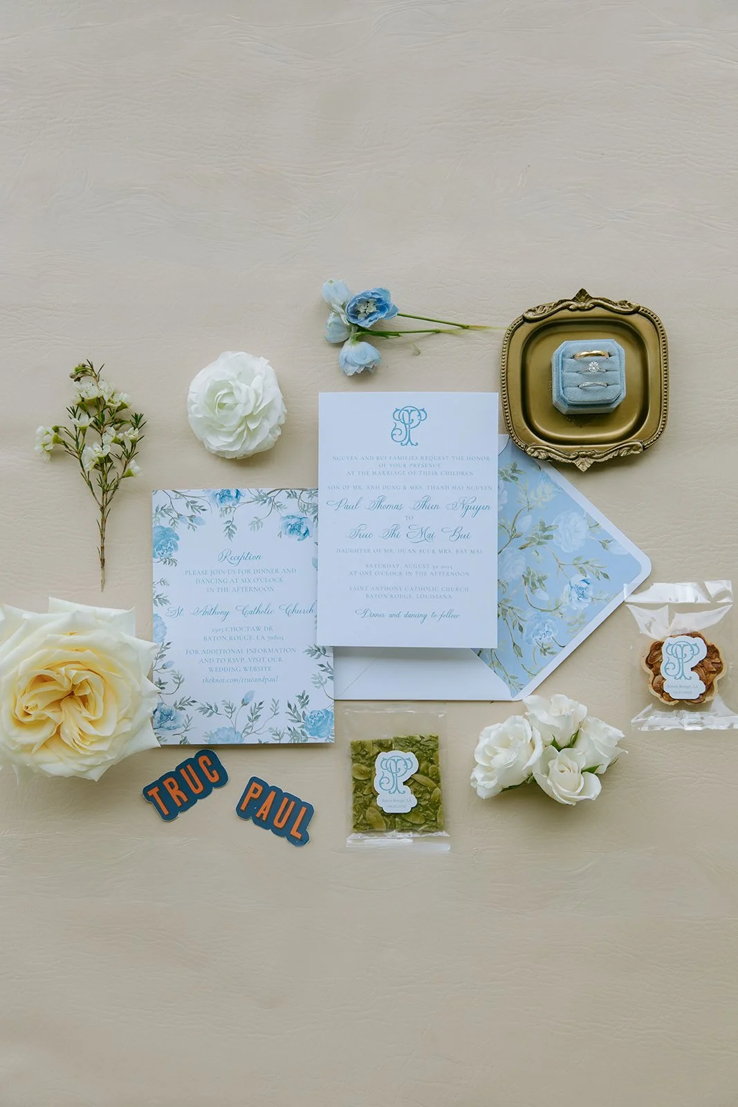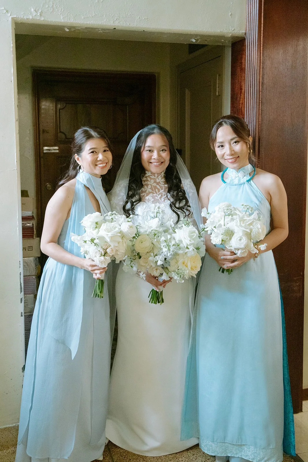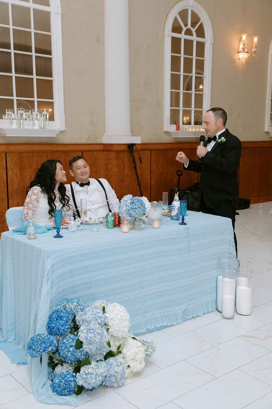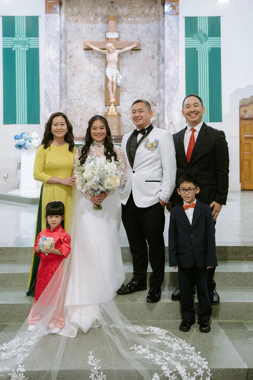 Truc had a traditional Vietnamese wedding with a morning tea ceremony, afternoon mass and evening reception with a 9-course meal. As part of Vietnamese tradition, the bride + groom take a photo with every guest. We designed a gorgeous (and gigantic!) blue + white hydrangea installation to serve as the photo backdrop. Due to the size of the mantel, Hannah designed this entire installation on-site!